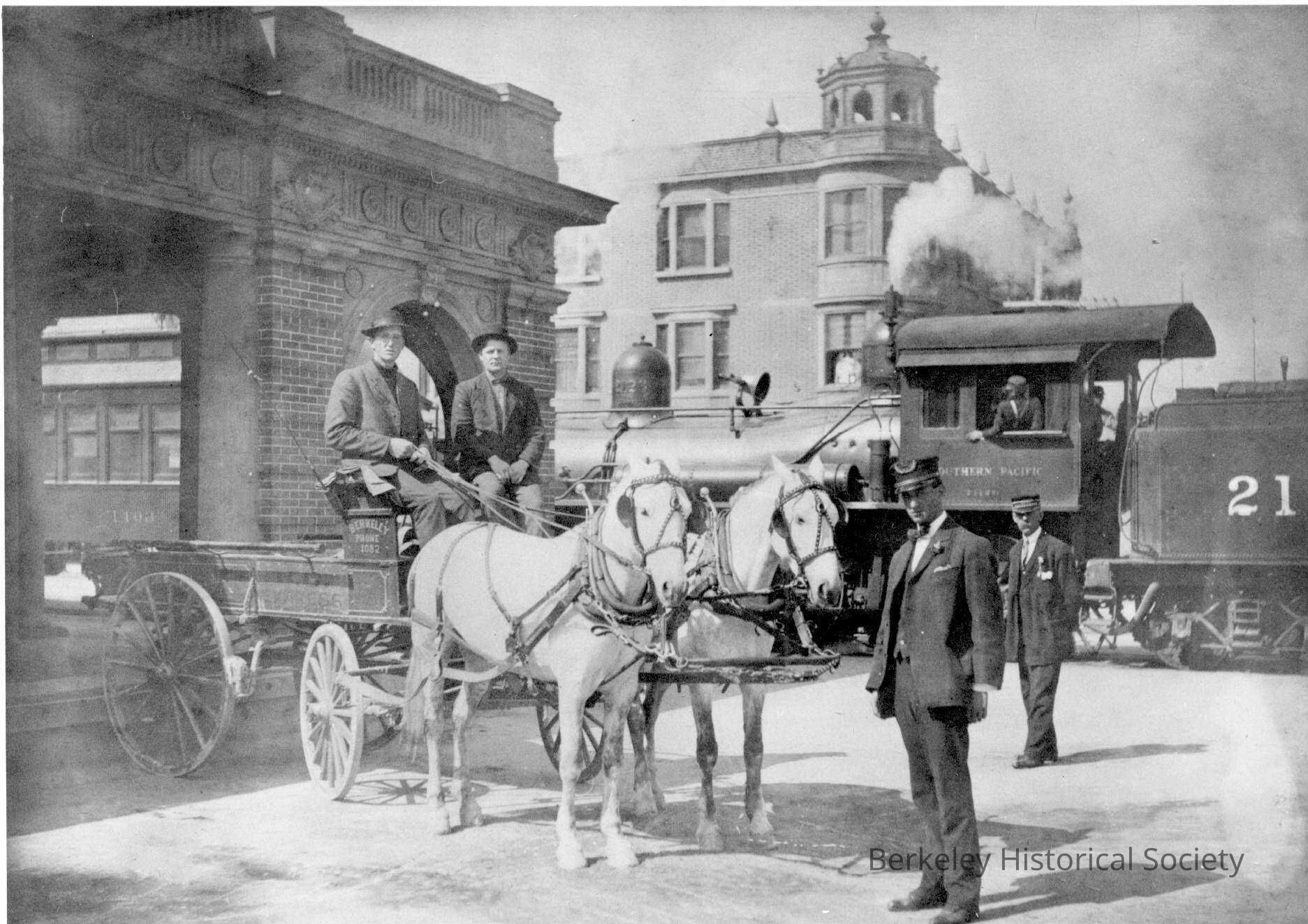 Horse-drawn wagon with teamsters; steam train and crew