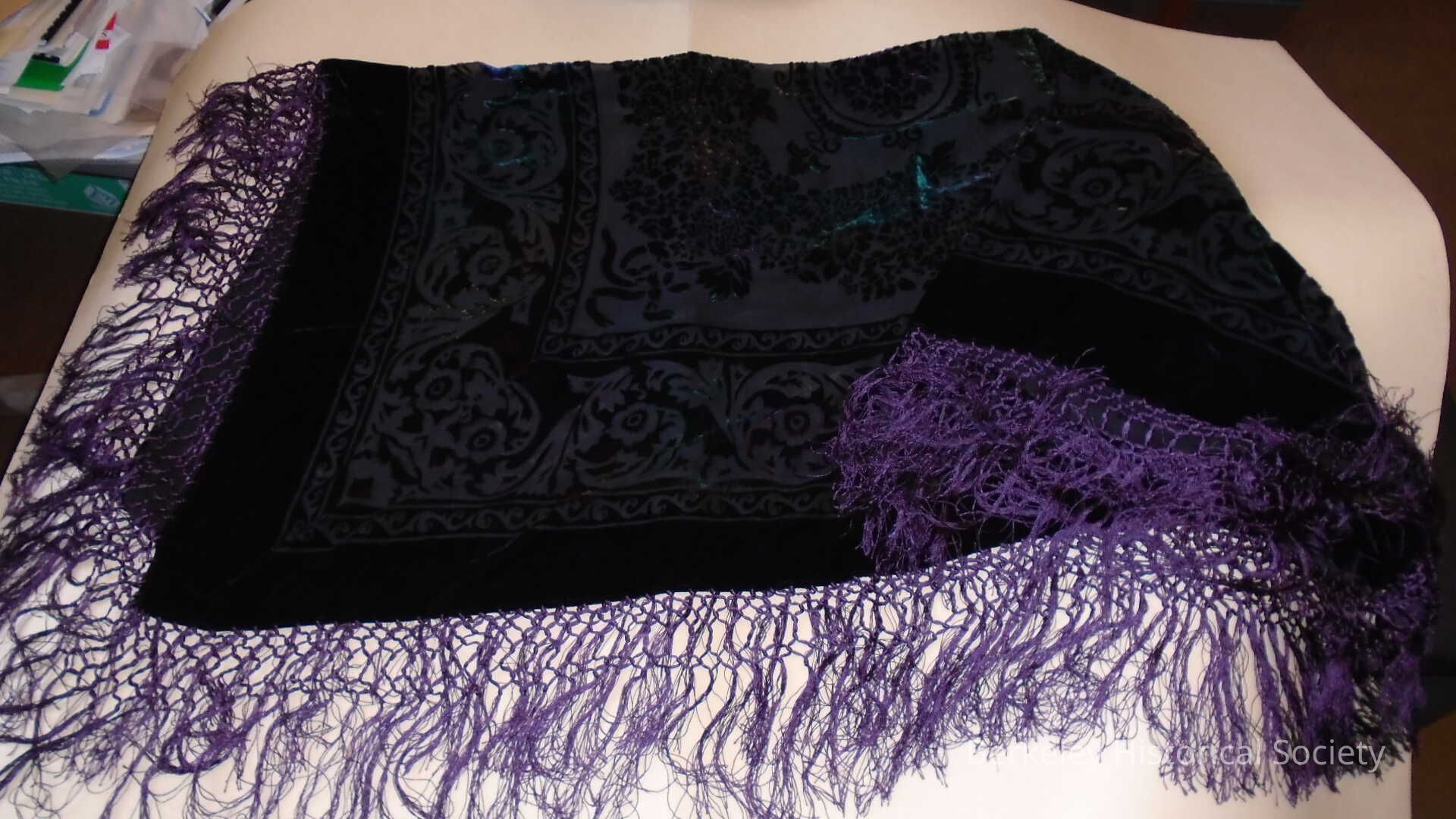 Square, silk & rayon velveteen shawl. Purple with long knotted fringe. Label: Museum collection Kensyo. Worn by Shelley Rideout.