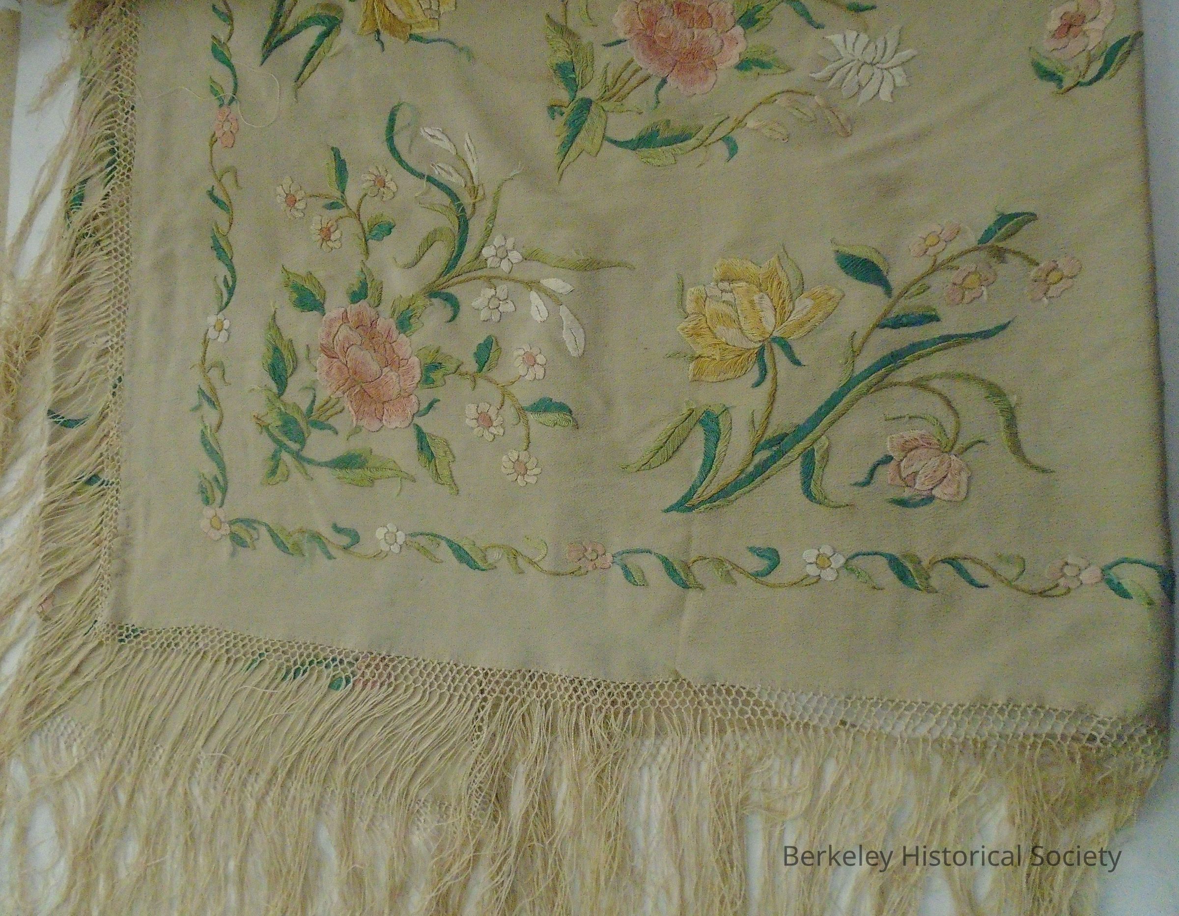 Large, square, cream colored, silk shawl with 9" fringe around edges. Embroidered with pale pink, yellow and white flowers (peonies, roses, daisies). For family history see 2006.036.001Made/Created