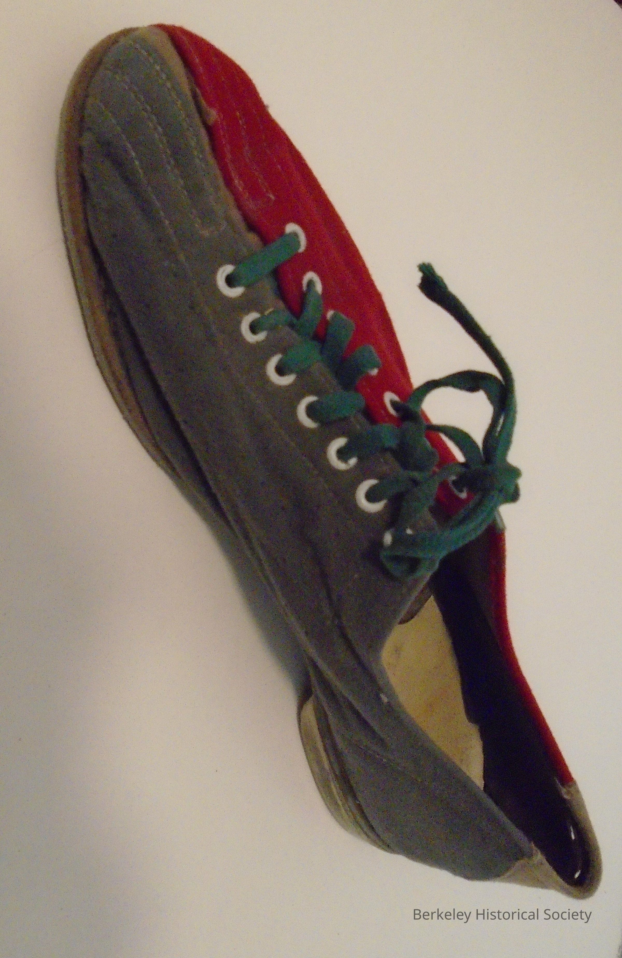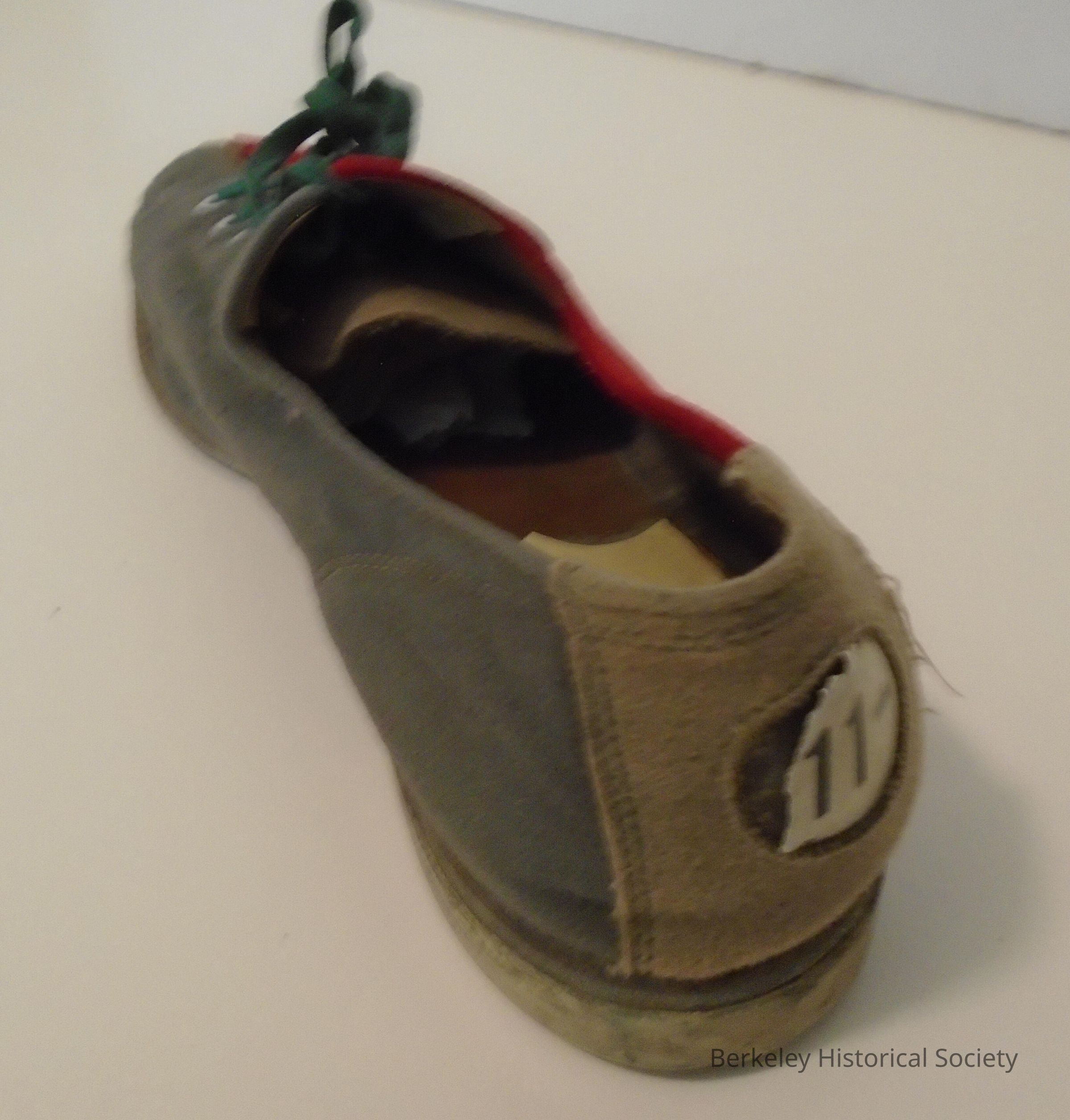 Bowling shoe for right foot. Shoe upper and tongue are made of suede like synthetic fabric, red on the wearer's right side and grey on the wearer's left. The tongue and piece behind the heel are tan. Green flat shoelace. Plastic circle inset with "11-" printed on it, slightly torn, on heel. Leather sole and hard plastic heel, both worn. Used at Berkeley Bowl, 2777 Shattuck Avenue; 1939-1972. Stamped "Berkeley Bowl" on the sole. See also 2002.012.002 (identical shoe).Made/Created