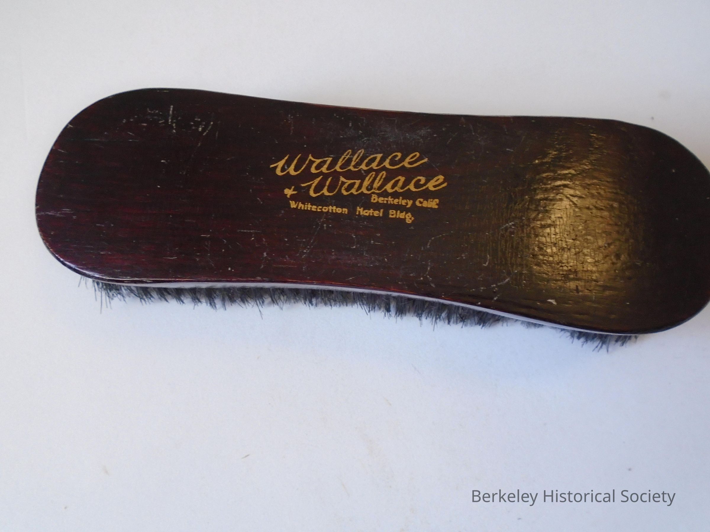 Brown, wood handled shoe brush, black bristles. Stamped on top: Wallace & Wallace Berkeley Calif. Whitecotton Hotel Bldg.