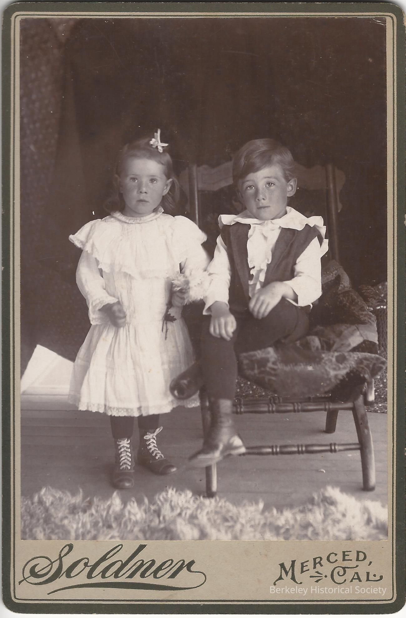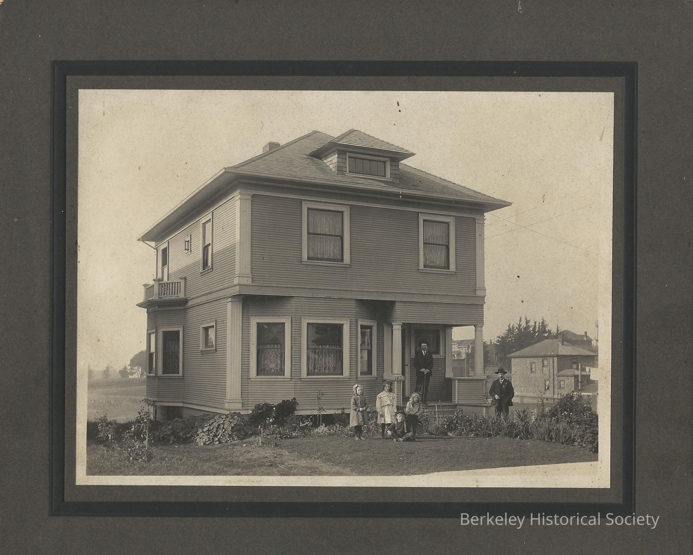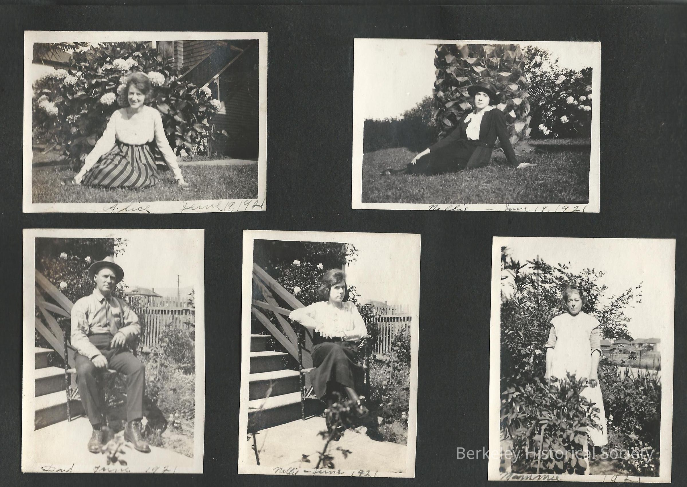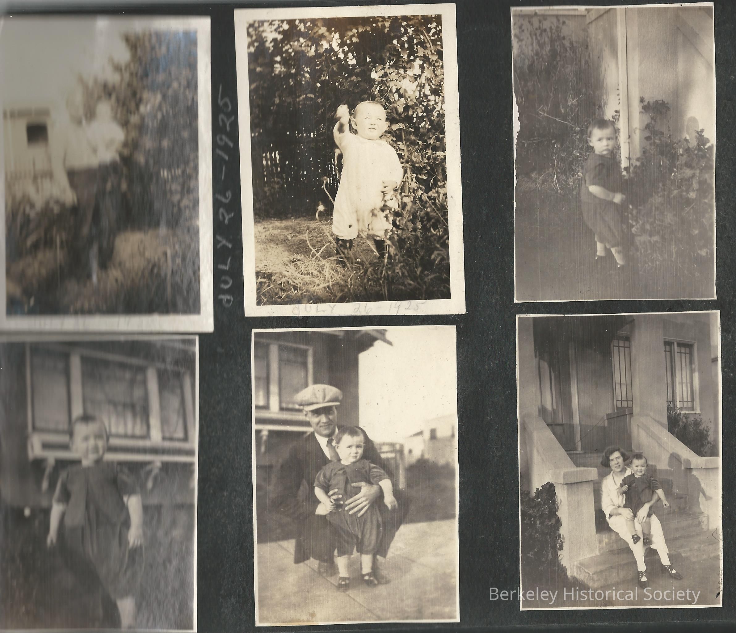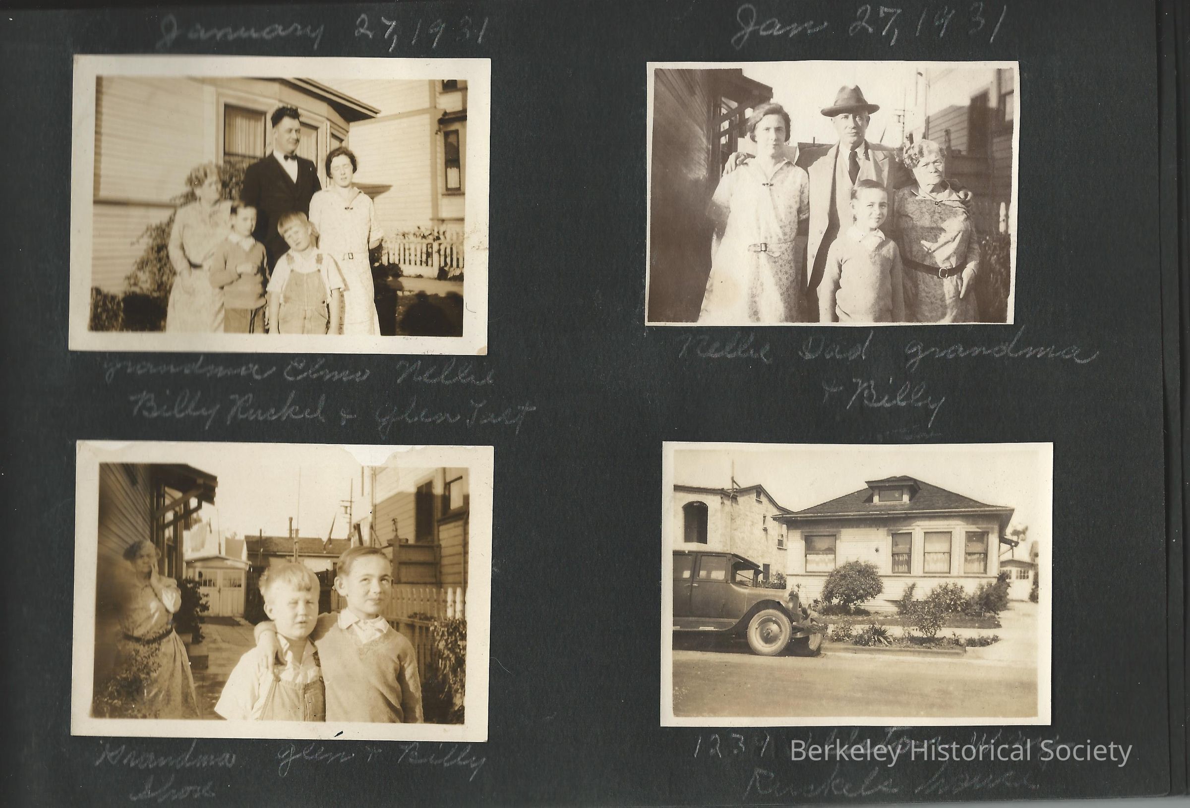 Photograph album of the William J. Shore family, with many photos of his daughter Nellie Mildred Shore, later Nellie Ruckel, wife of Elmo F. Ruckel. Photos include Shore, his wife Nellie, the Ruckels' son Bill, other family members and friends. The Shore family had a house at 1405 Hearst, of which there are few photos, also the Ruckel house at1239 Allston Way. A few loose photos accompany the album, including a large print of the Sears house at 1428 Grove Street . Nellie Ruckel Shore annotated the back of a few photos in 1983. Accompanying this, a few Native Sons of the Golden West membership items for Shore, ca 1924-27, and a Berkeley High School graduation program, June 1943, showing Bill Ruckel as a graduate.