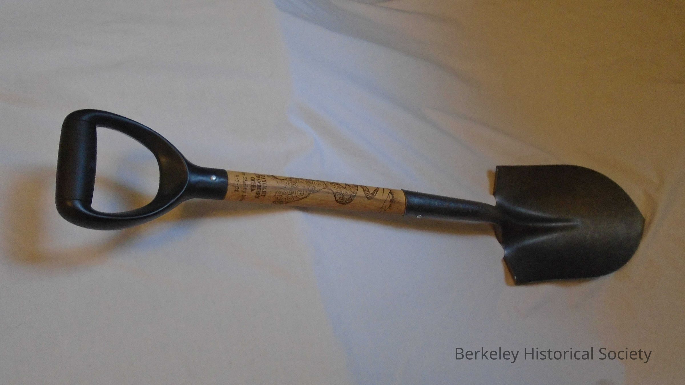 Ceremonial shovel with wood stock and metal handle and base. Base is stamped with "USA tempered 2". Wood stock has wood burned design of a winding creek running down from hills and sun with "DAYLIGHT STRAWBERRY CREEK Mayor Shirley Dean 9-7-02" at the bottom.