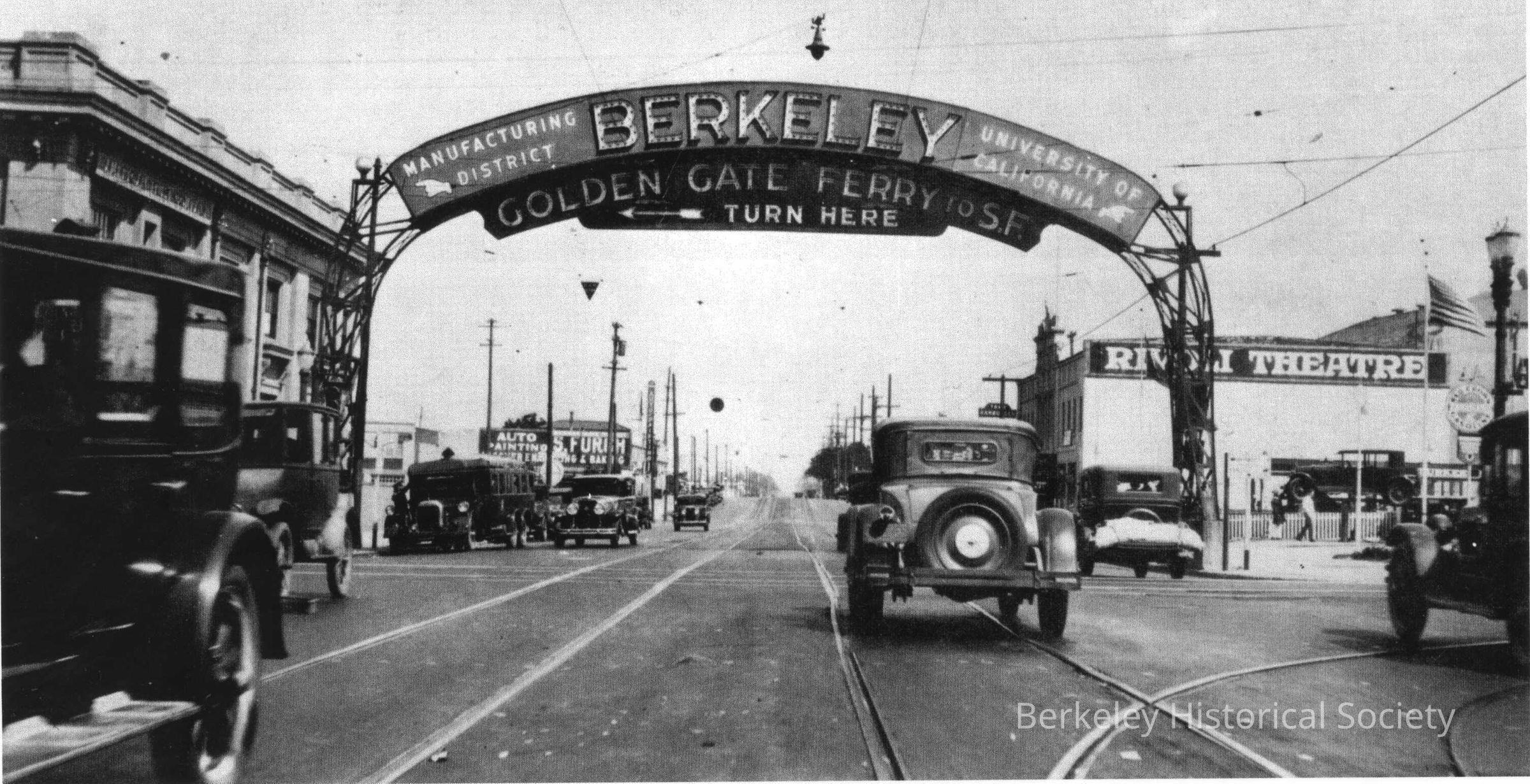Rivoli Theater, 1939 San Pablo, Double streetcar tracks on San Pablo, Tracks on University, Streetscape