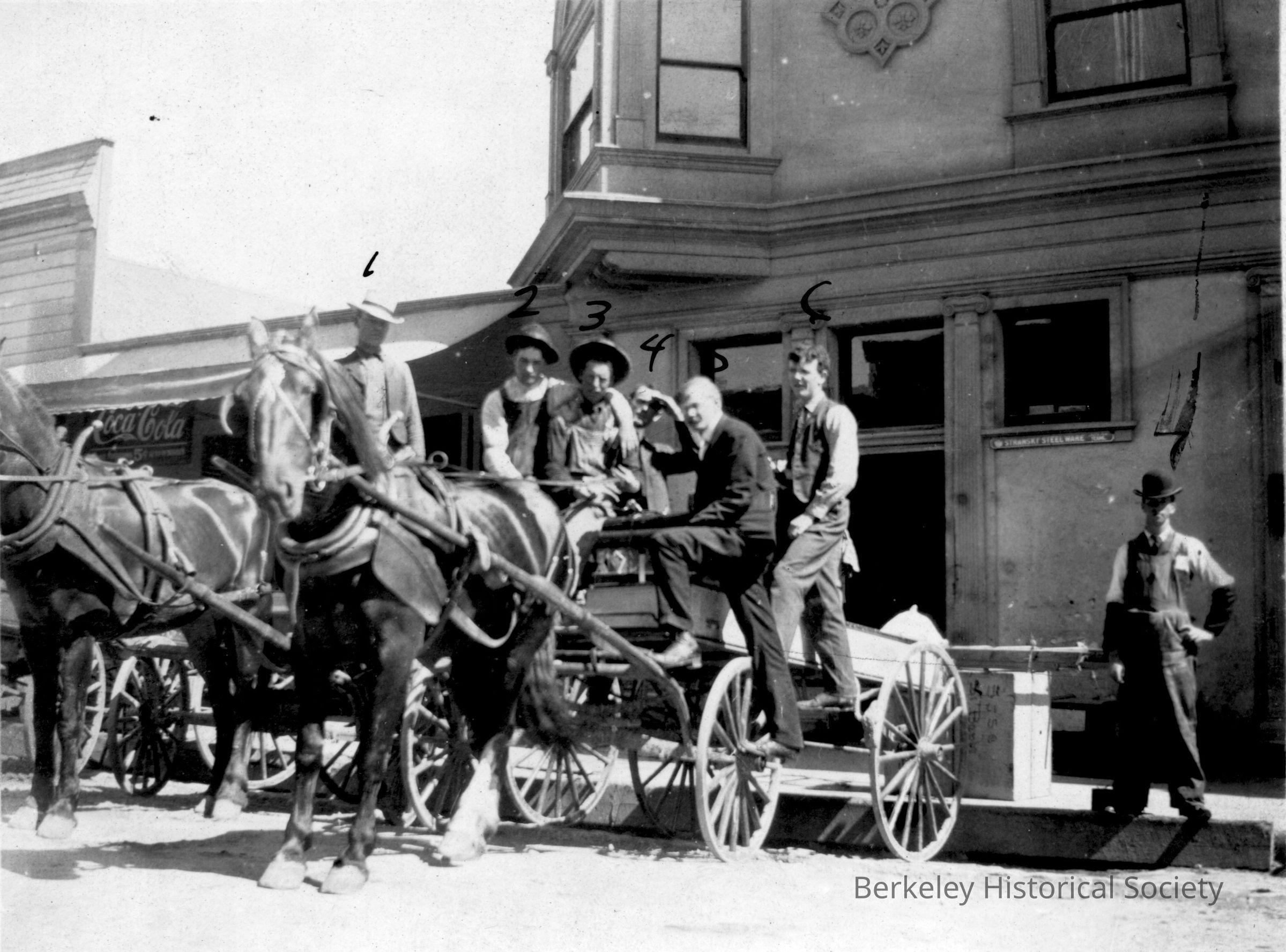 Horse drawn delivery wagon; seven men in image with numbers written above for identification which is not present.Other Names and Numbers