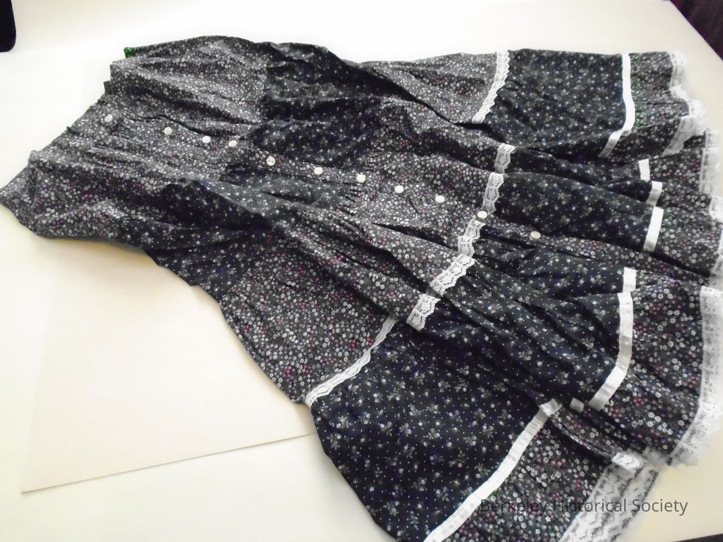Cotton layered ruffled skirt (peasant style), black with pink floral print. Buttons down front and lace trim. Calf length, size 13. Worn by Linda Rosen in Berkeley.
