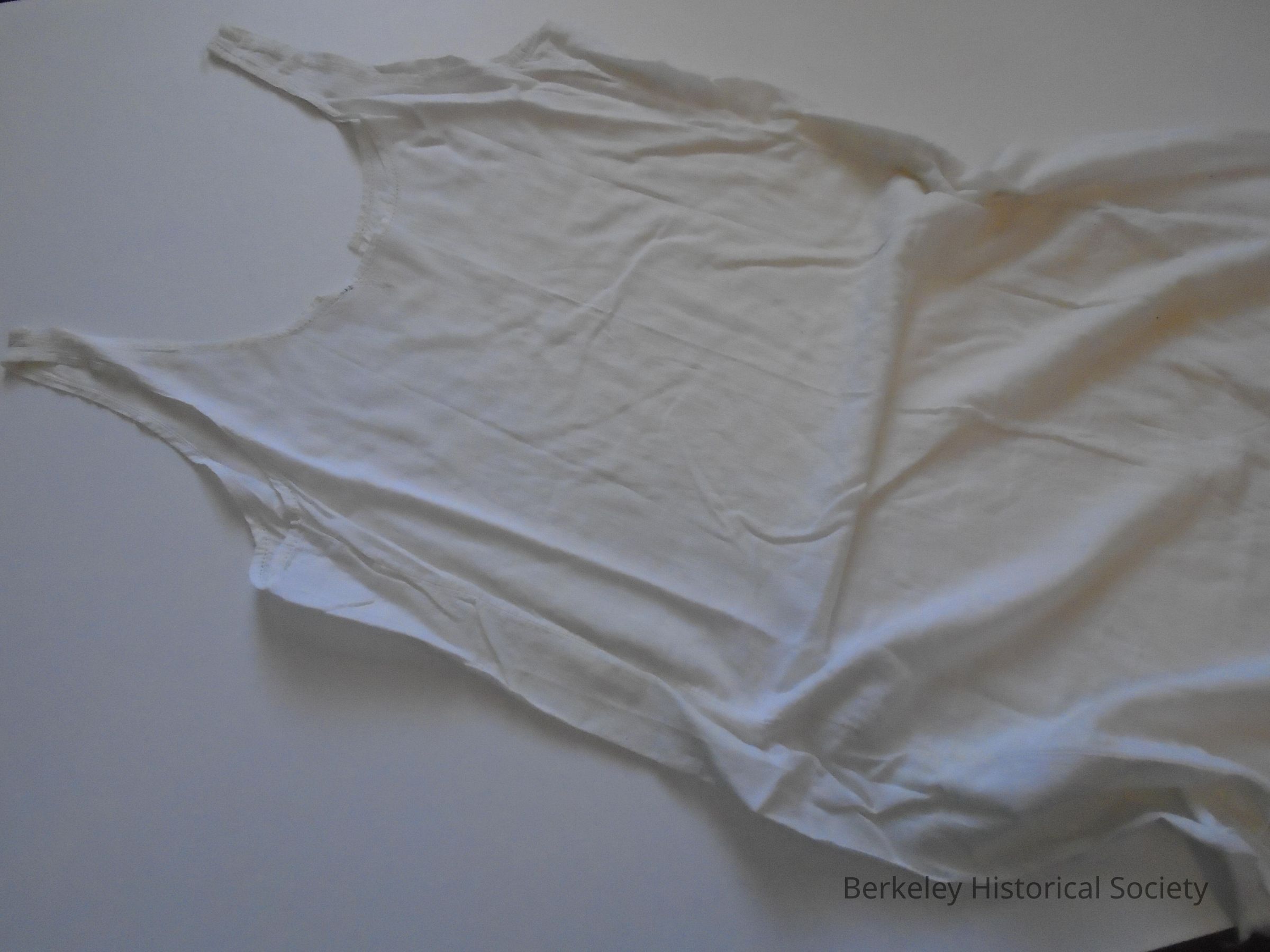 Plain, white cotton (muslin) slip. Straight/sack style, hand-sewn neck and arm seams. Remainder is machine-sewn with turned seams. 2" machine hem. There is no lace or "trim".