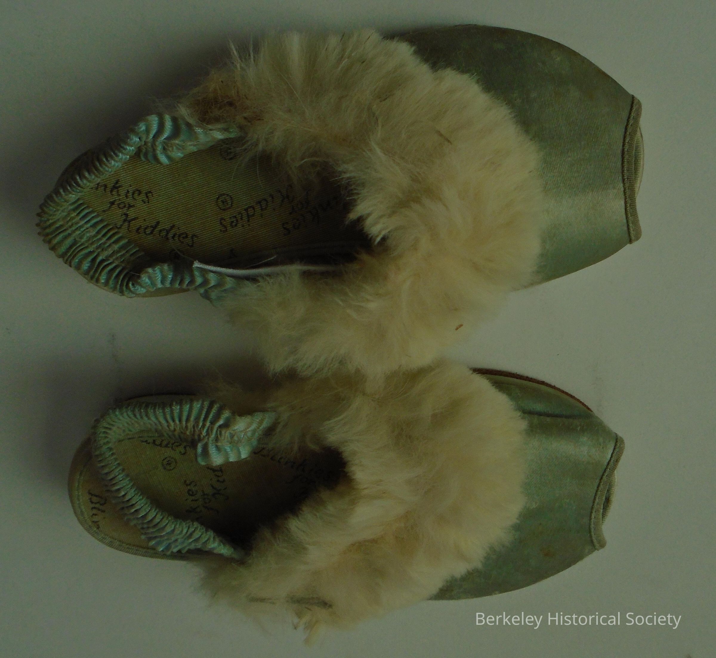 Little girl's slippers...blue satin scuffs with rabbit fur trim, cut out toe, elastic around open heel. Stamped on sole: "Blinkies for kiddies". Used by Arza Ralph, probably. 1711 Francisco St.