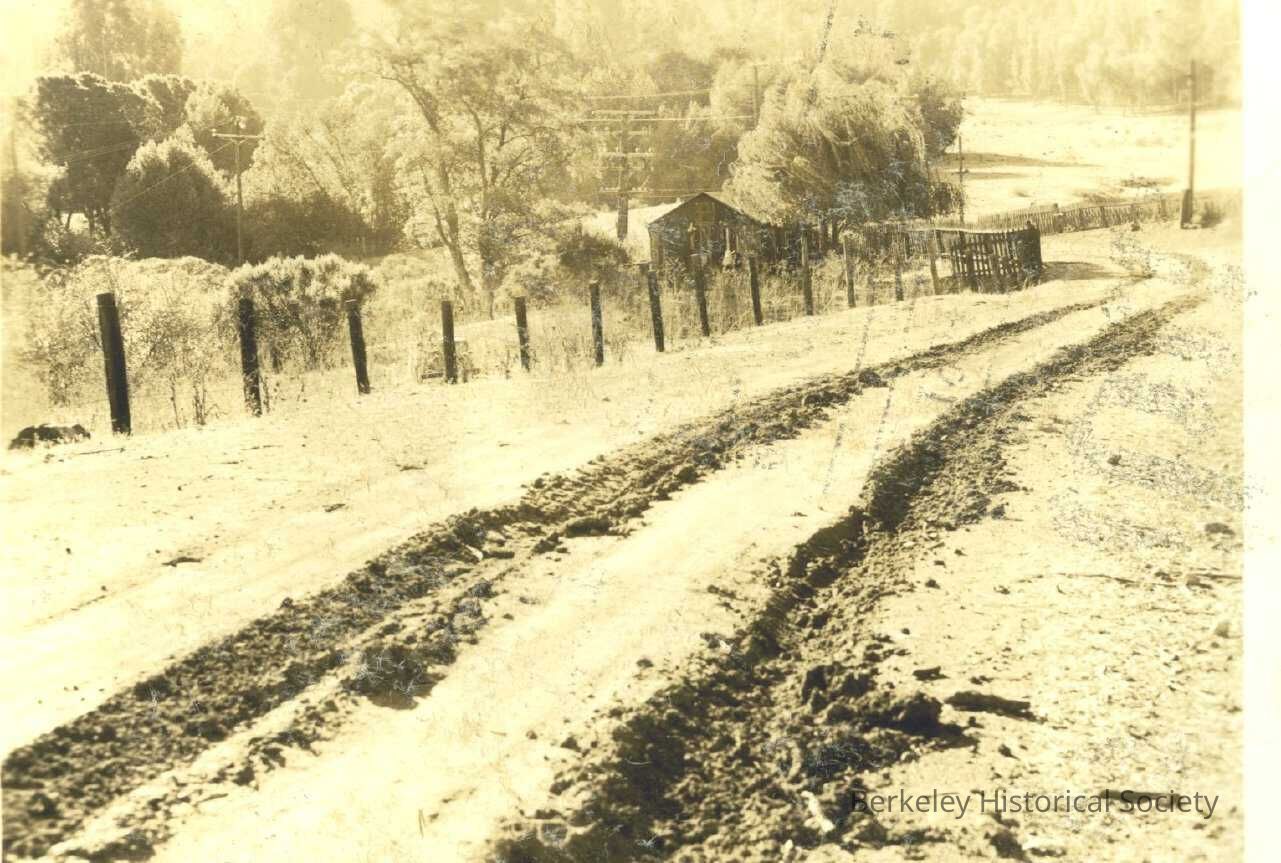 Road with muddy ruts, snow on ground, house, fenceMade/Created