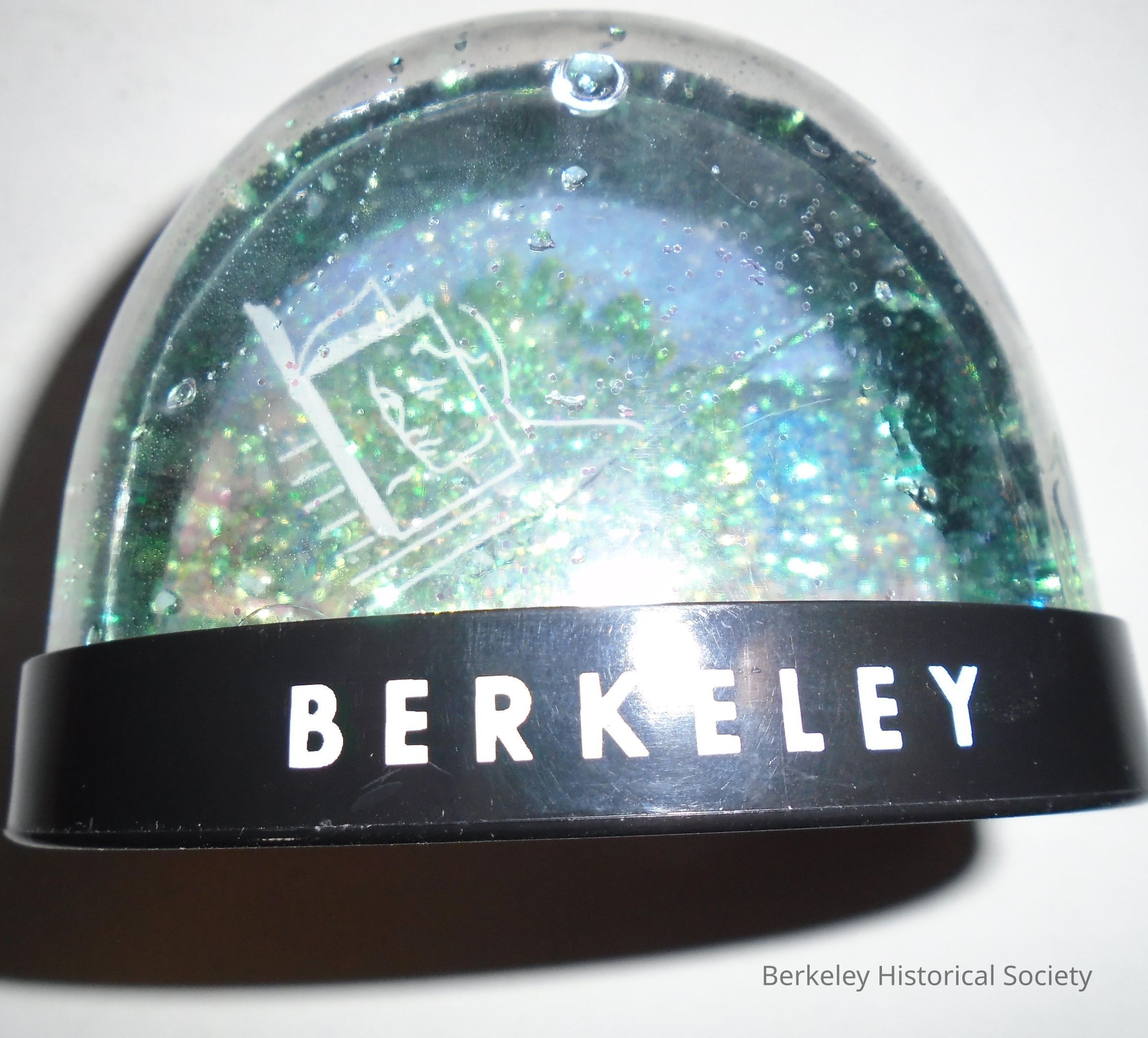 Plastic glitter snow globe (dome) depicting Cody's Bookstore on Telegraph Ave. Logo is superimposed on front with text: "Cody's Books Berkeley". Cody's closed its store on Telegraph on 7/10/2006. Cody's was one of Berkeley's best known and loved bookstores...for decades. It changed hands and relocated several times to 4th St. and then to Shattuck Ave., but closed for good in 2008. See also 2006.045.001.Lexicon