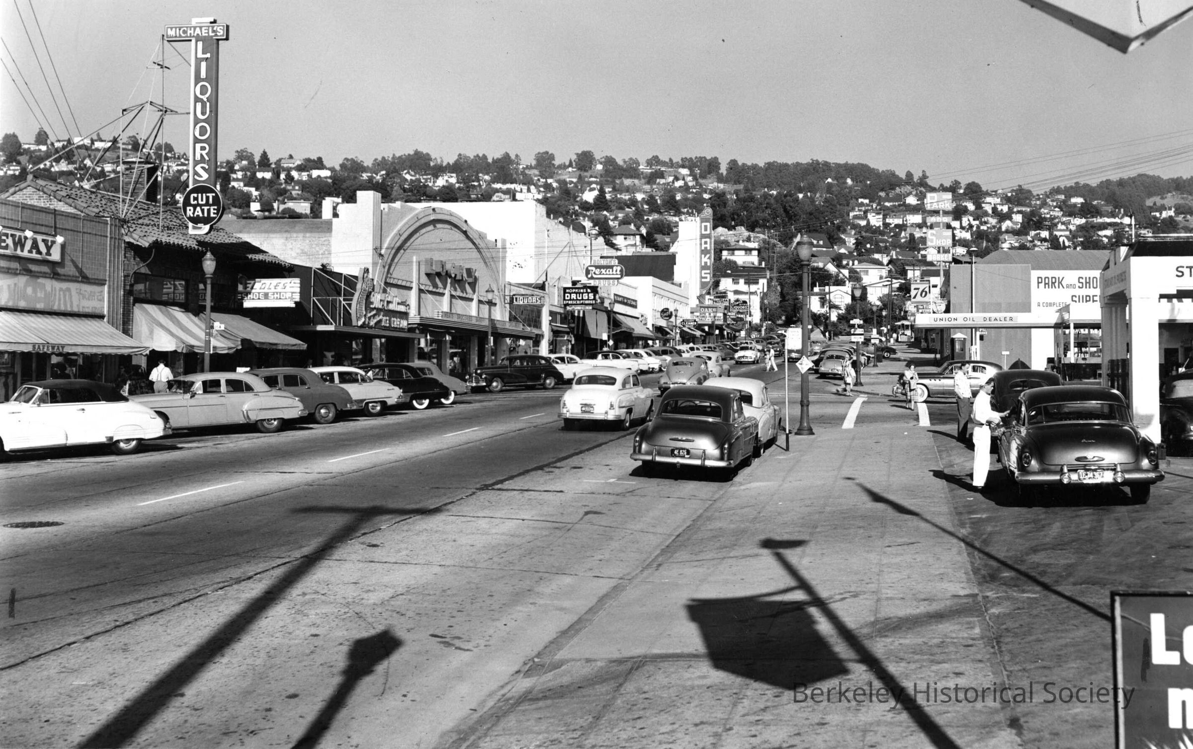 Includes Safeway, Michael's Liquors 1819 Solano, Coles' Shoes 1821 Solano, McCallum's Ice Cream 1825 Solano, Lucky Supermarket 1831 Solano, liquor store, Hopkins Drugstore, 1845 Solano, Bolton Rexall Drugs 1849 Solano, Park & Shop 1850 Solano, Oaks Theater 1875 Solano. Service Stations: Chevron, Union 76Lexicon
