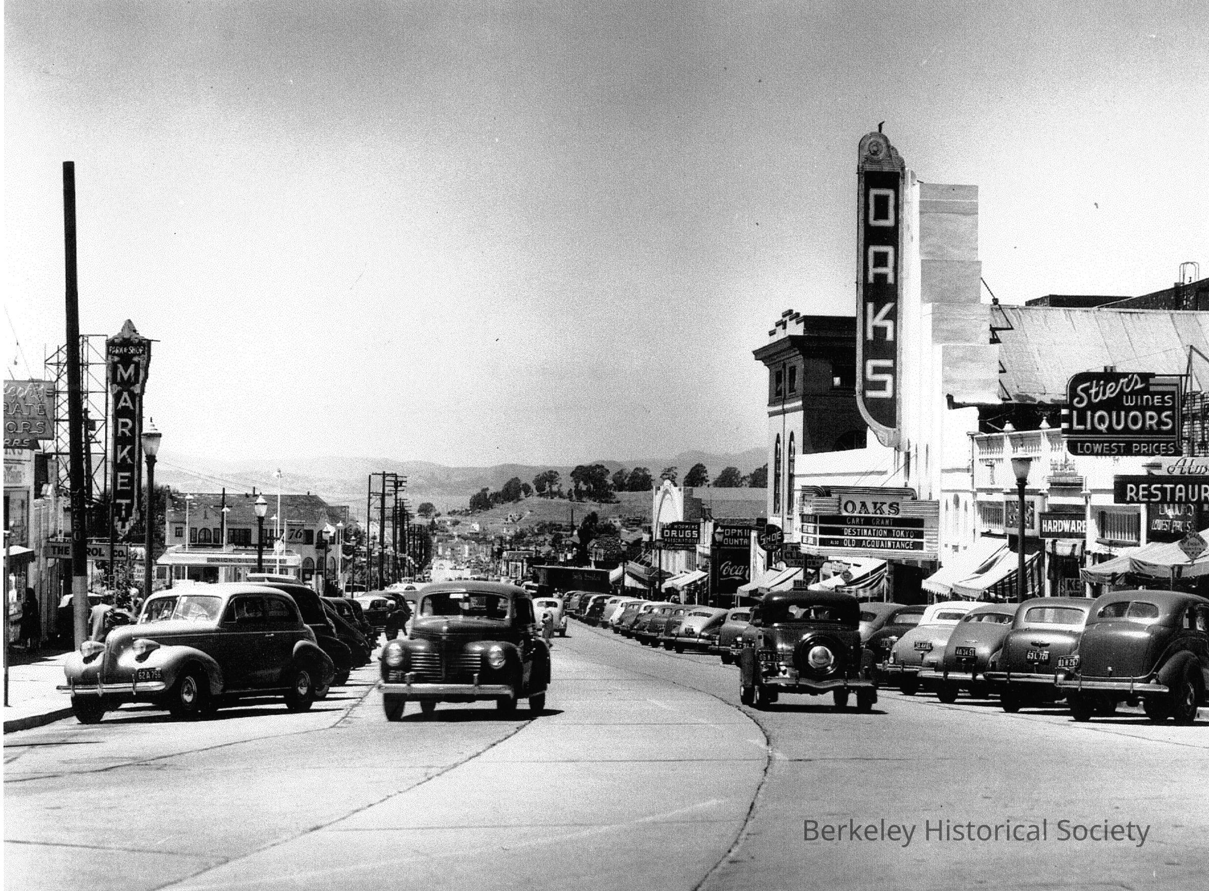 View west from top of Solano Avenue. Visible are Stiers Liquors, Oaks Theater, Park and Shop Market. Many parked cars, a few in street. The two movies on the marquee came out in 1943.