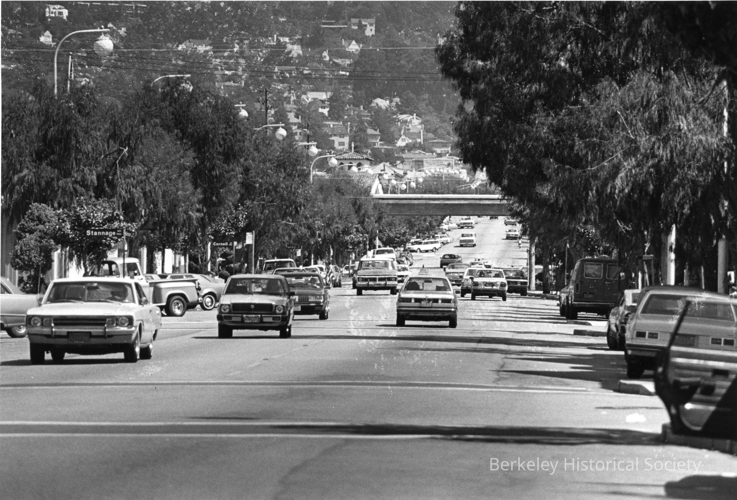View east on Solano Avenue from about Stannage; cars in street, BART overcrossing in mid-distance.