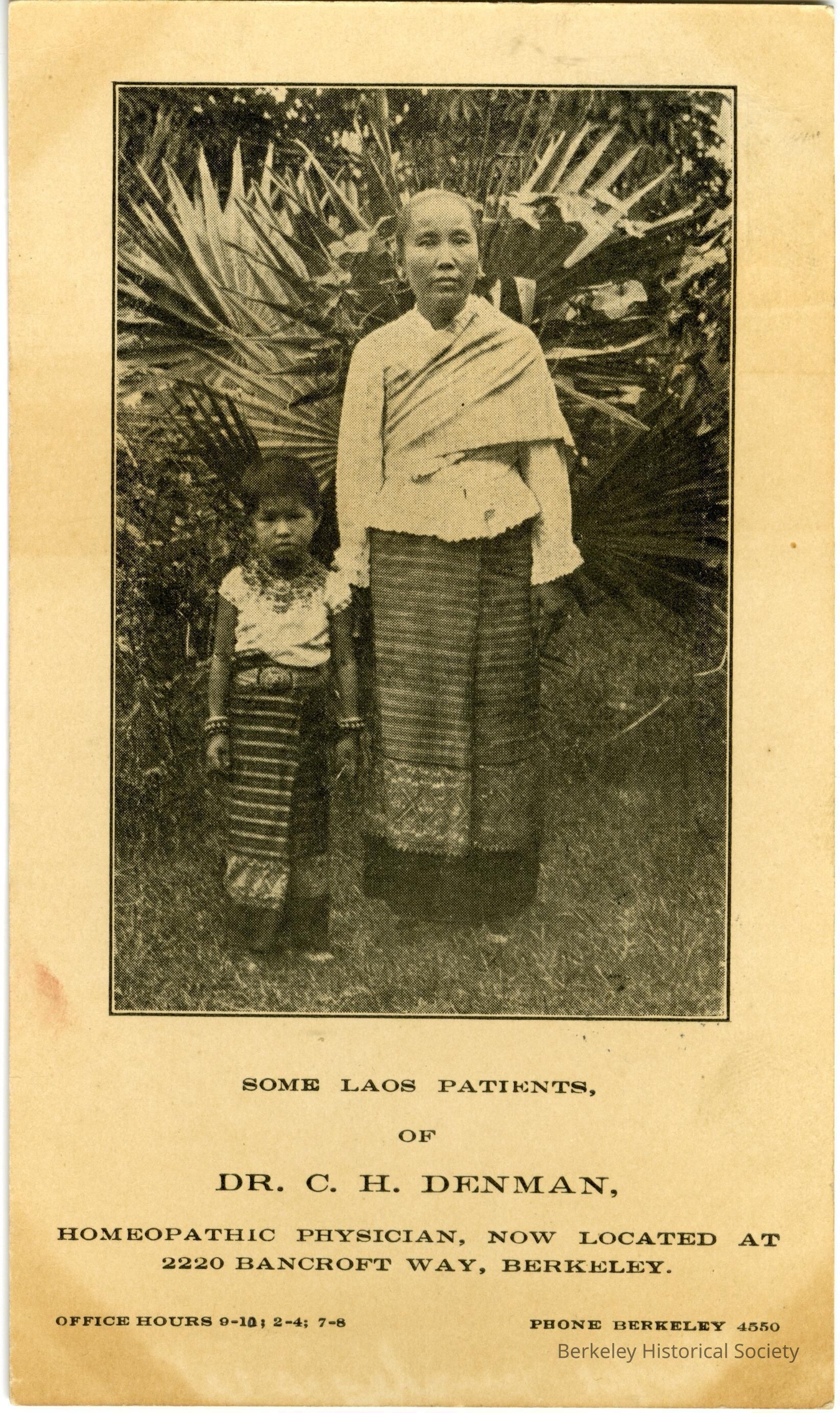 Undivided postcard advertising the office of Dr. C.H. Denman, homeopathic physician located on Bancroft Way. Illustration shows mother and child from Laos. Postmark and stamp present.