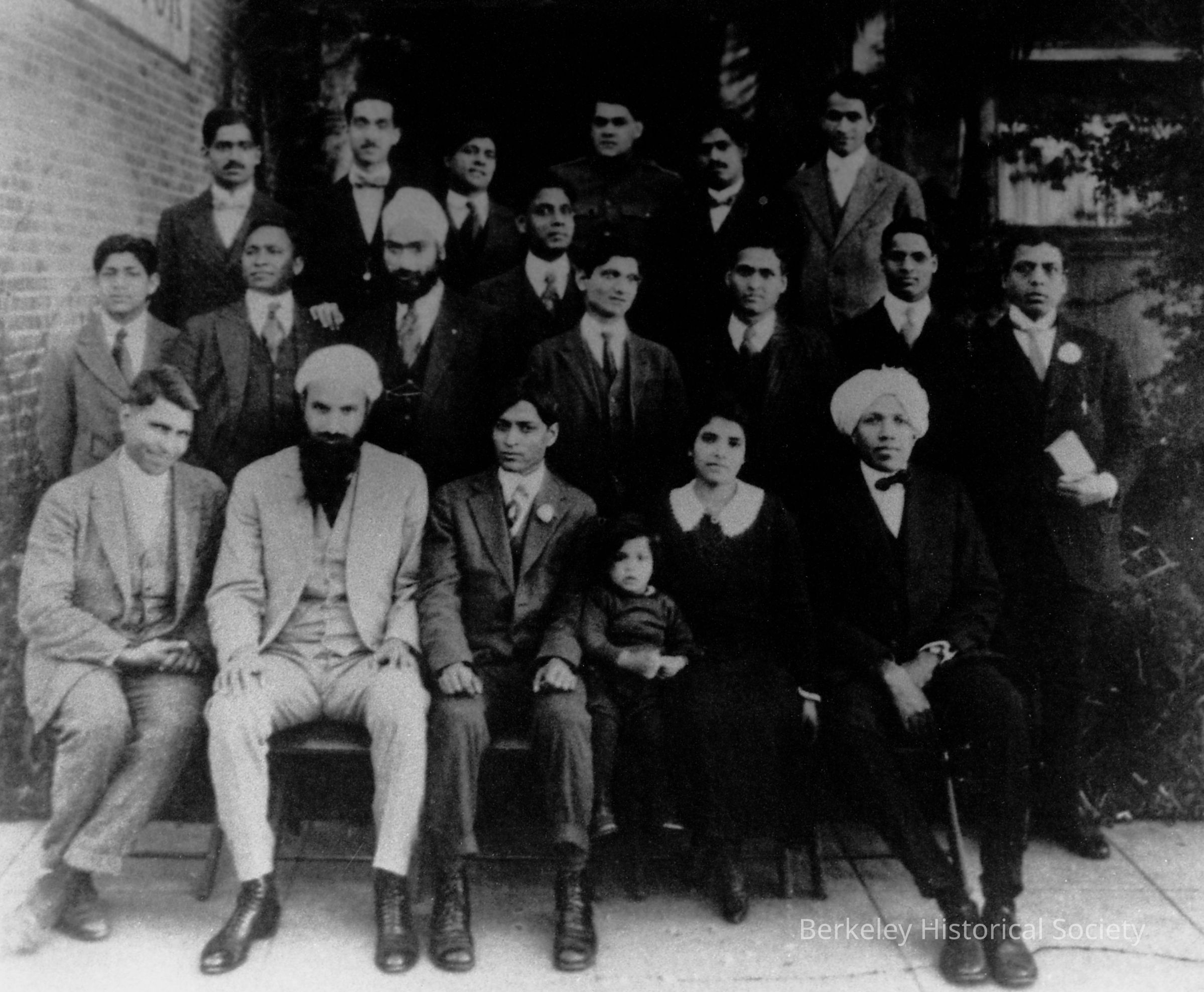 Group of men sitting on stairs of unidentified building; One woman with child in front row.Other Names and Numbers