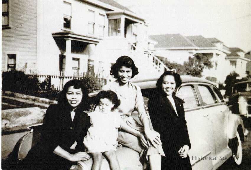 Three divided postcards featuring black and white photograph of a family leaning against a car outside. No message present. Postcard advertises the Berkeley History Room. Note in "Berkeley Post Cards" binder identifies location as the Flatlands.