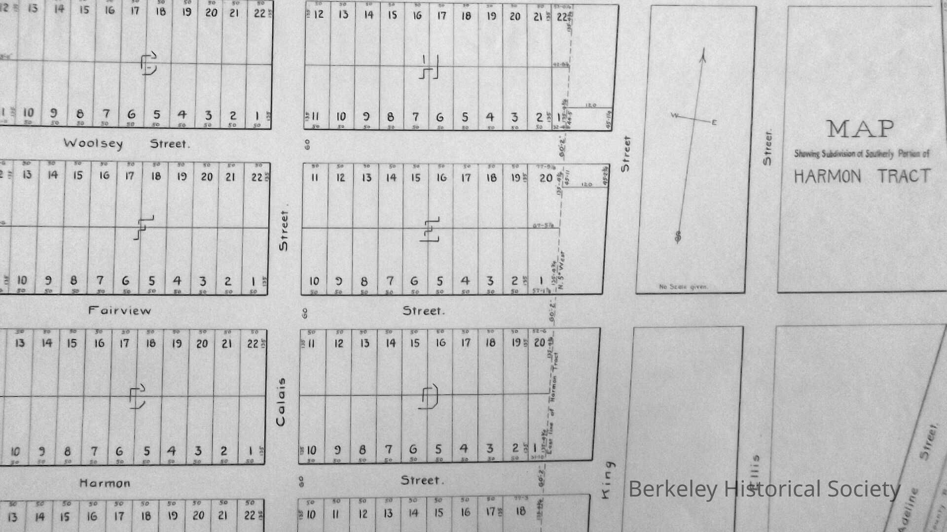 Map showing subdivision southern Portion of Harmon Tract, Filed 21 Feb 1886, California and Nevada RR, Berkeley Railroad, Alcatraz Station, Lorin Station