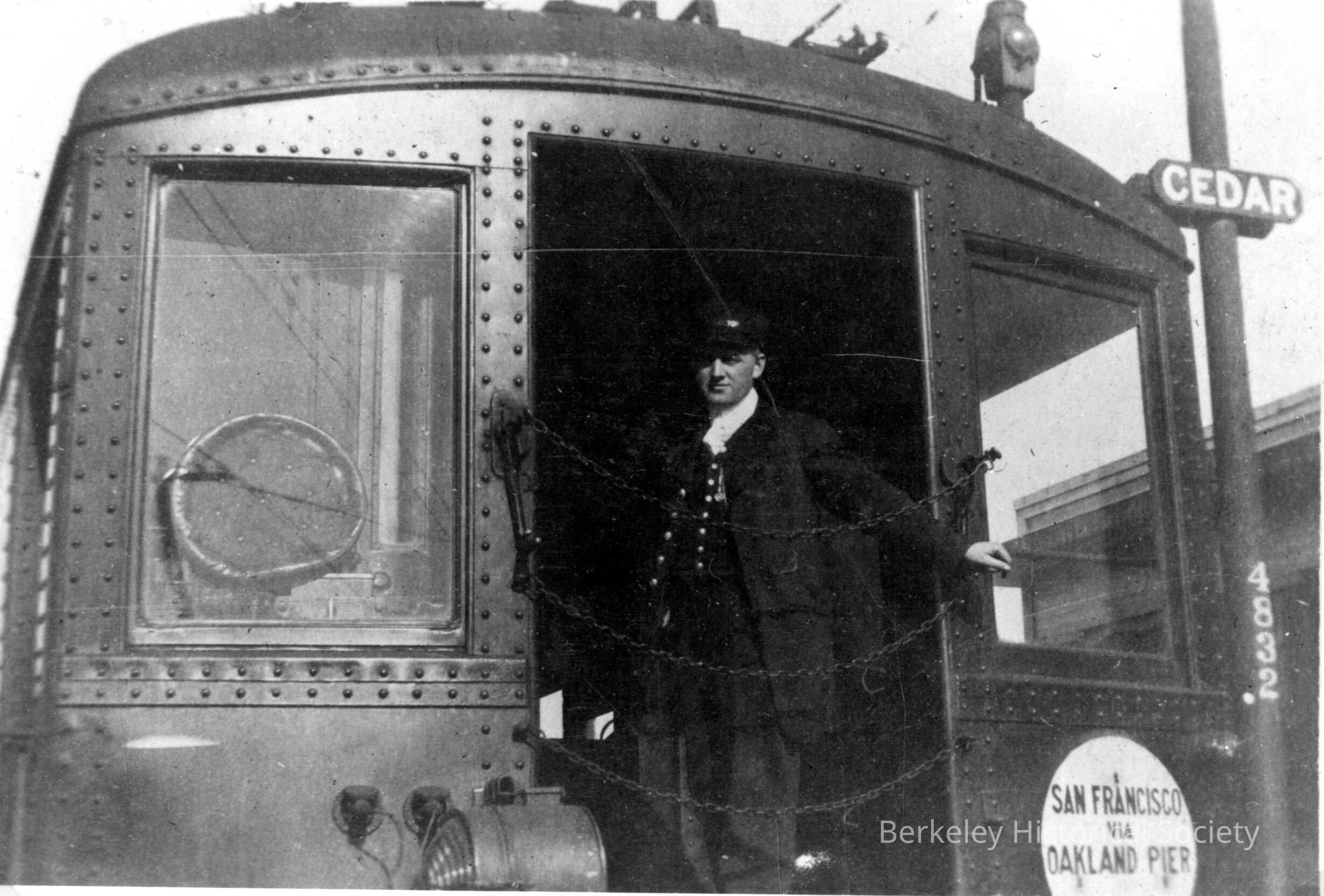 SP Interurban, 1918. Last car with conductor standing in doorway. California Street @ Cedar Round sign on car: San Francisco via Oakland Pier