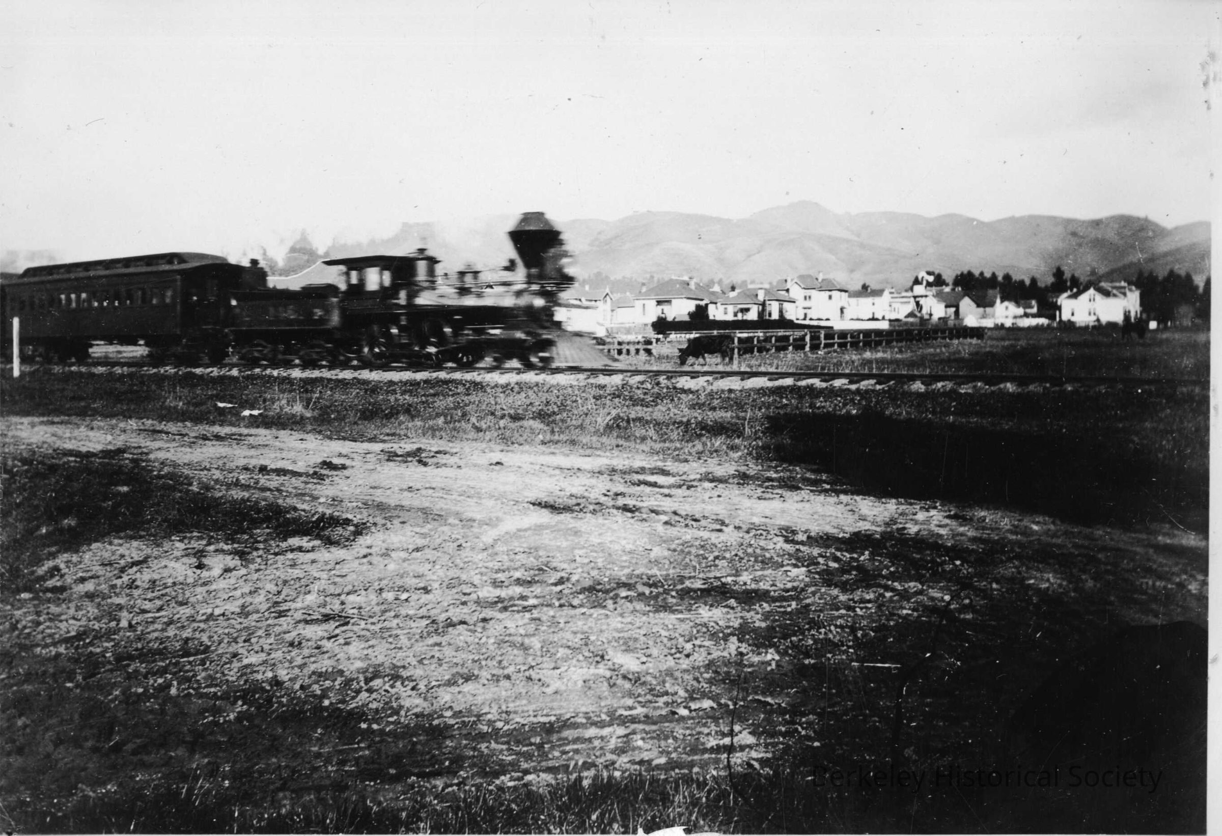 On verso: Looking east from Ward. 1886. Train heading south with hills and houses in background.