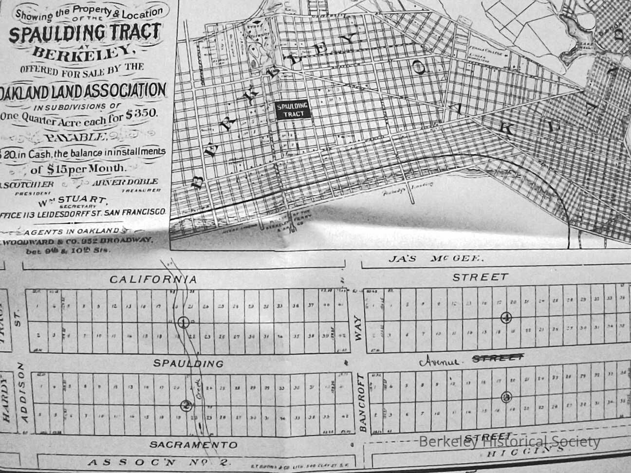 Copy of original. Map showing the Property and Location of Spaulding Tract at Berkeley, Offered for sale by the Oakland Land Association. One acre $350, Filed at request of Wells Fargo August 4, 1876Lexicon