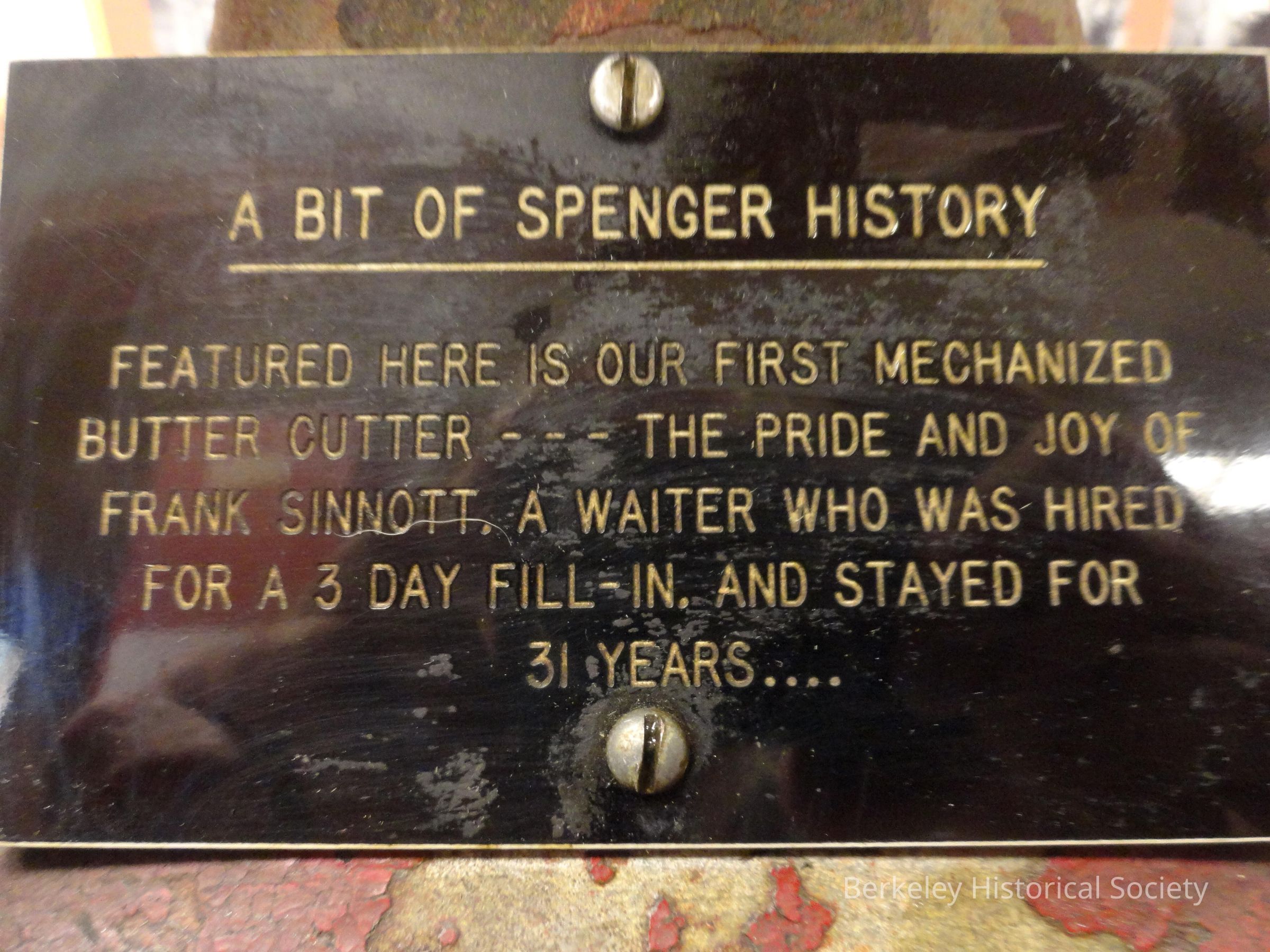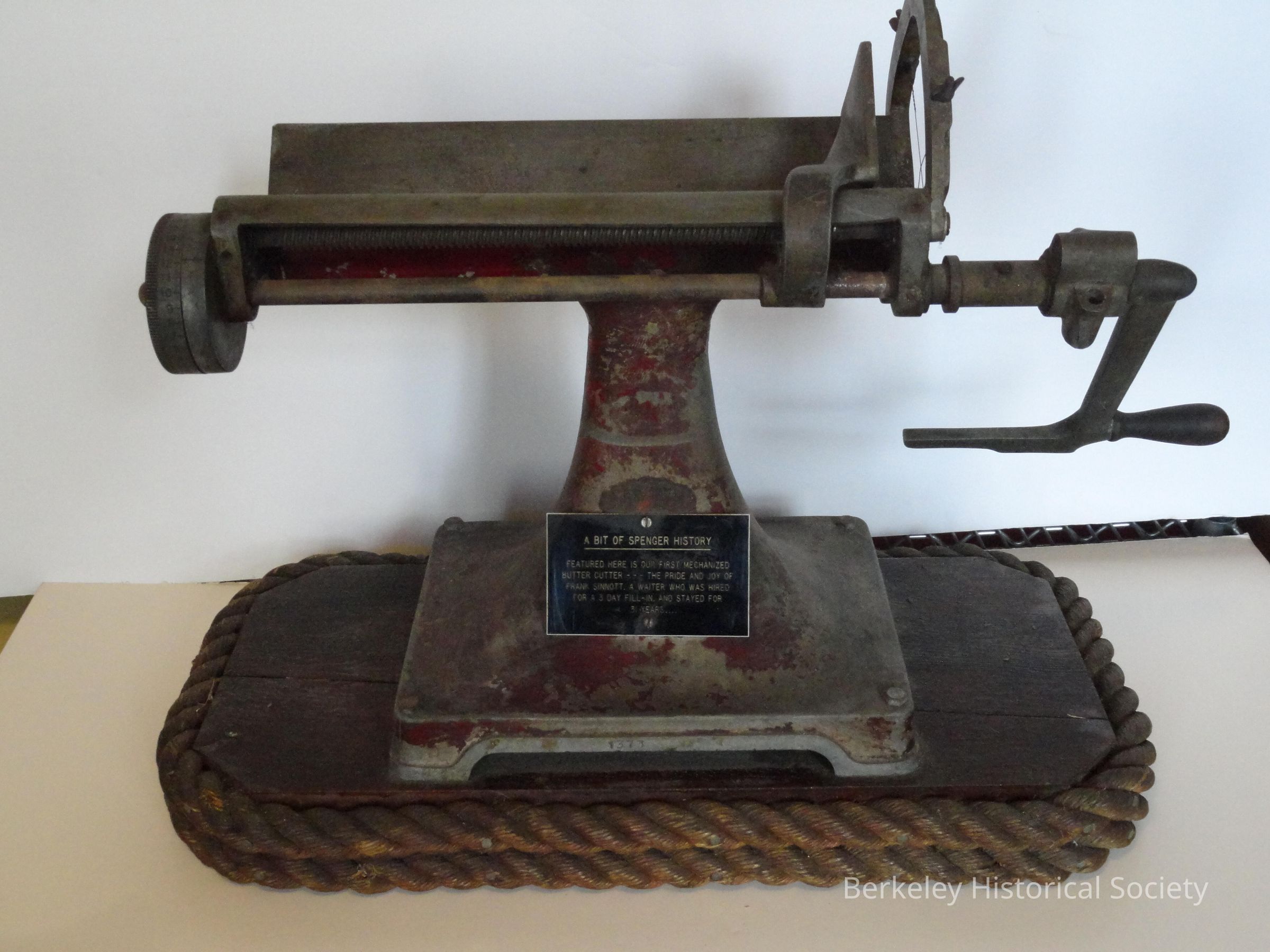 Mechanical butter cutter from Spenger's restaurant, invented by employee Frank Sinnott. Base is wood and rope design. Cutter is heavy metal and handle turns to move butter through the wire cross wires. Plaque in front tells history.Dimensions