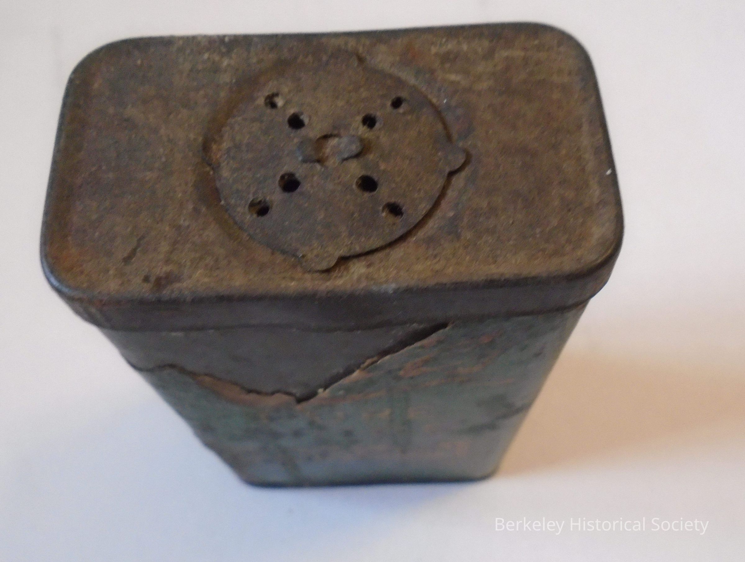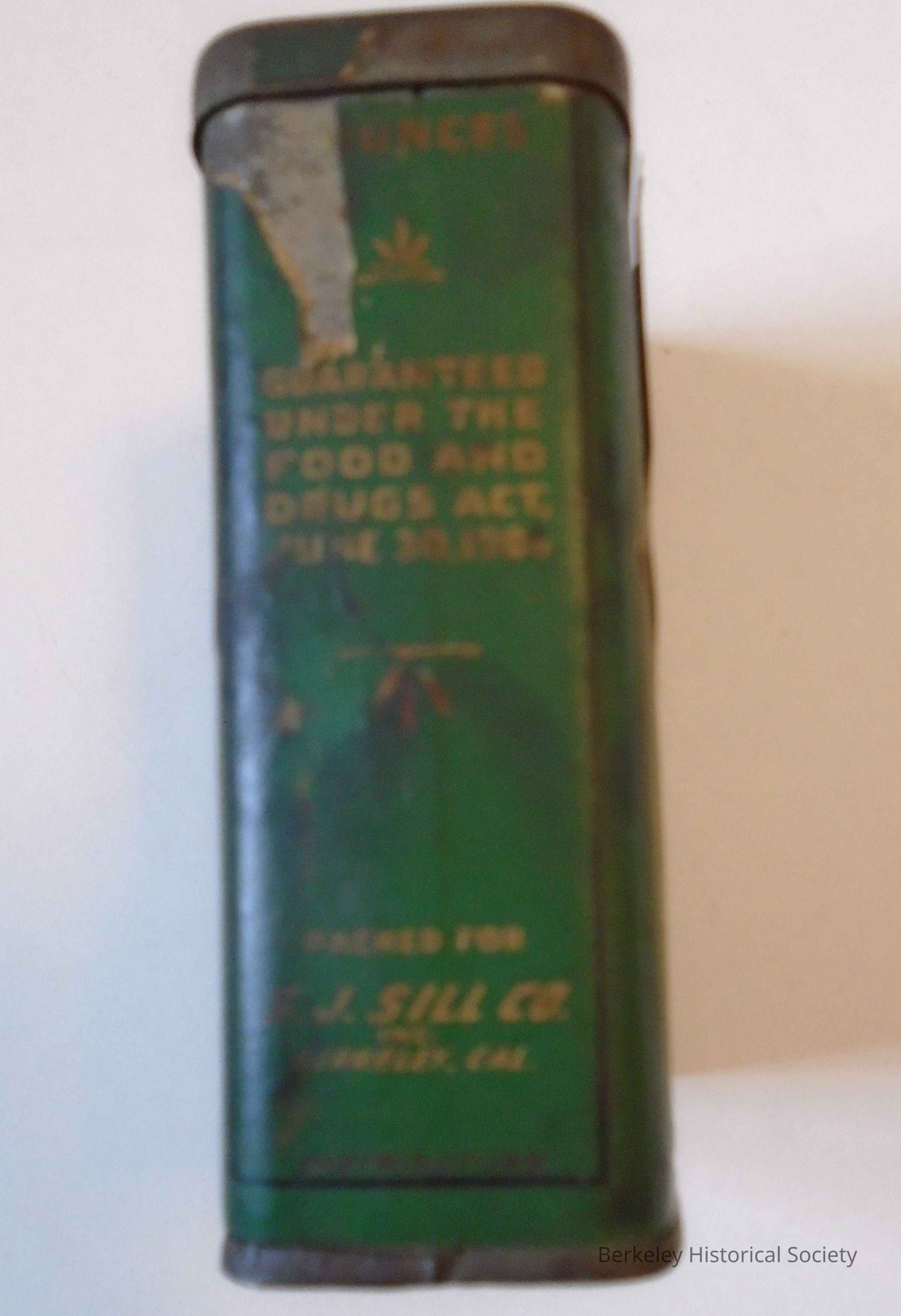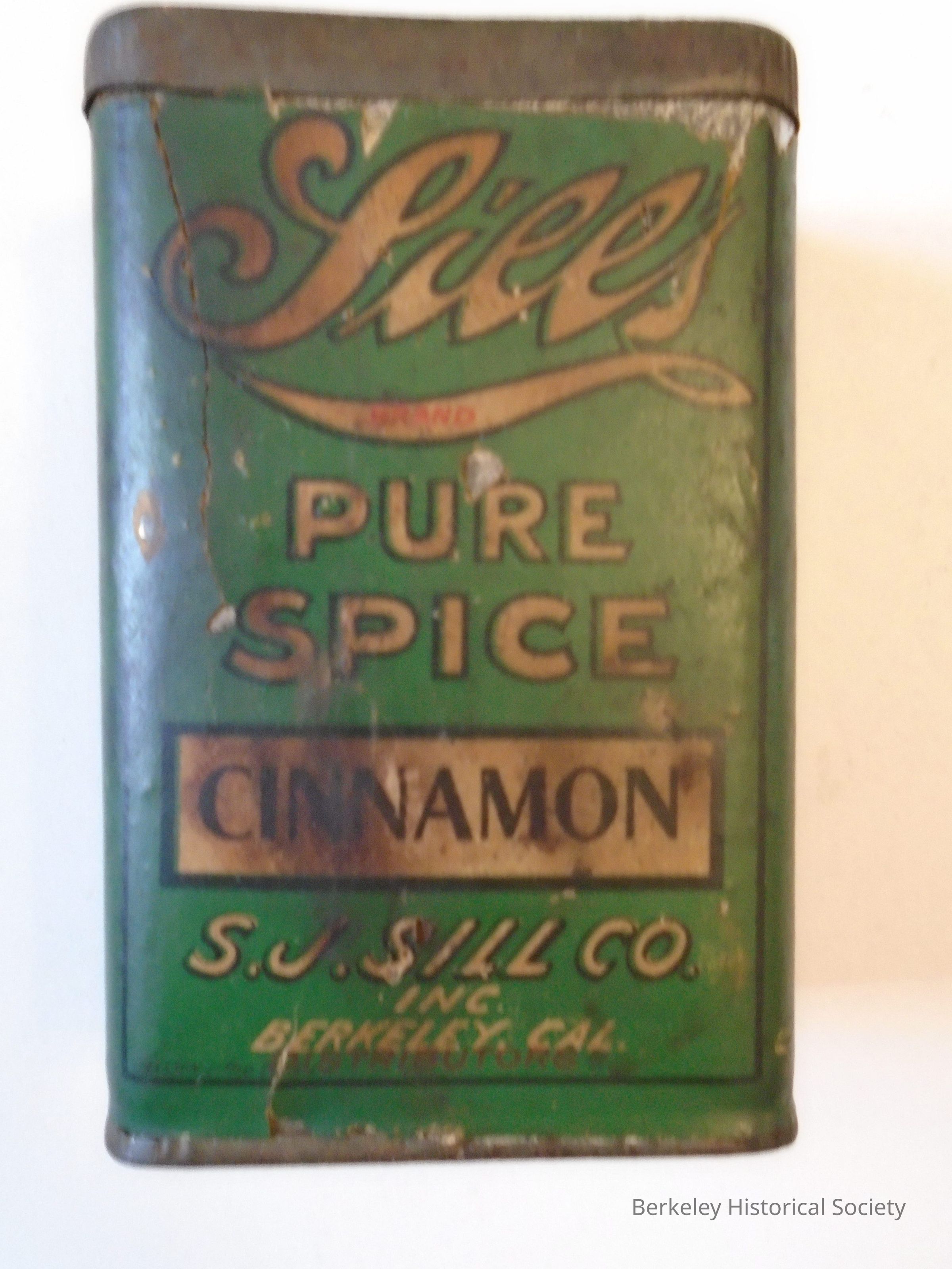 Spice tin (Cinnamon) with lid from S. J. Sill Co., Inc., Berkeley, Cal. Metal with green paper wrapper and "Sills Pure Spice". Tin is corroded, label is torn and discolored. Lid has a shaker top.Made/Created