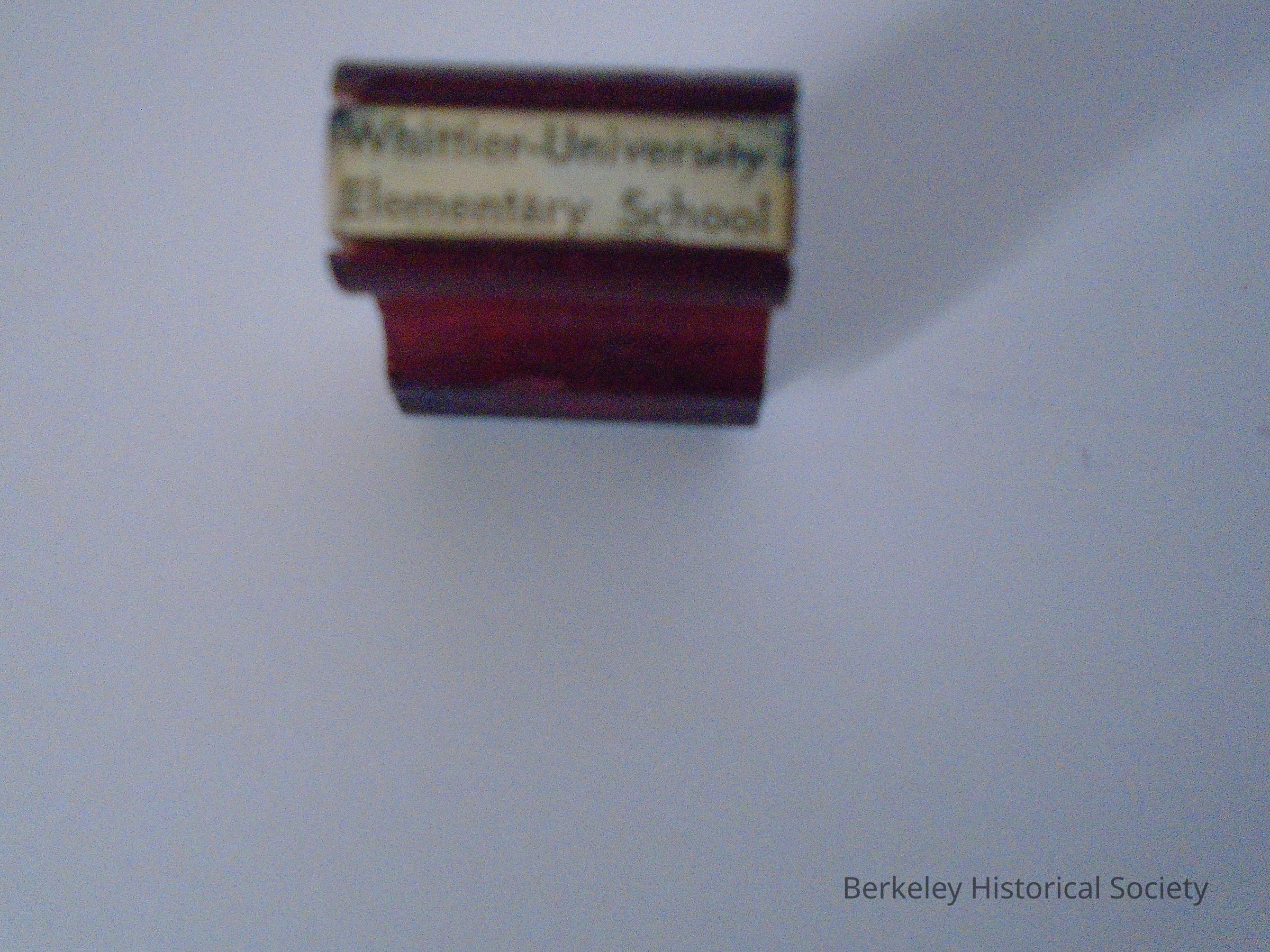 Rubber stamp from Whittier Elementary School. Wooden handle with indentations in front and back for fingers, white tab with part of stamp on top, ruber stamp on bottom. Stamp reads "Whittier -University Elementary School"Lexicon