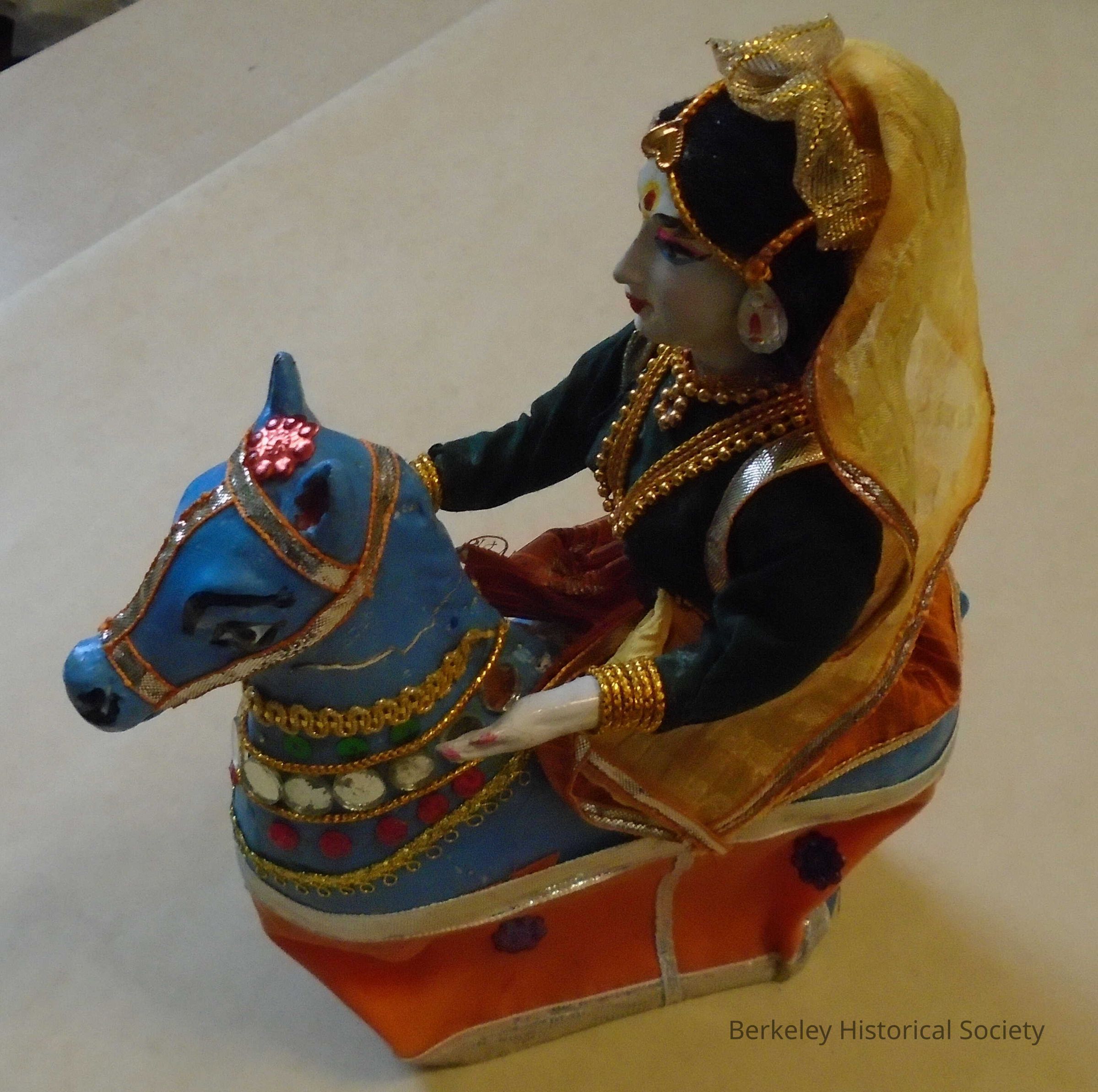 Statue of Hindu goddess, riding a blue horse. Plaster, cardboard and wood, with decorative dress of gold, black, orange material and cut mirror. Given to BHS by Neelum and Kirpal Khanna, owners of Bazaar of India (1810 University Ave.), after a walking tour of "Little India". Used in the Ethinic Heritage Exhibit. See Verticle File/Subject/minorities/East Indian for more info.Lexicon