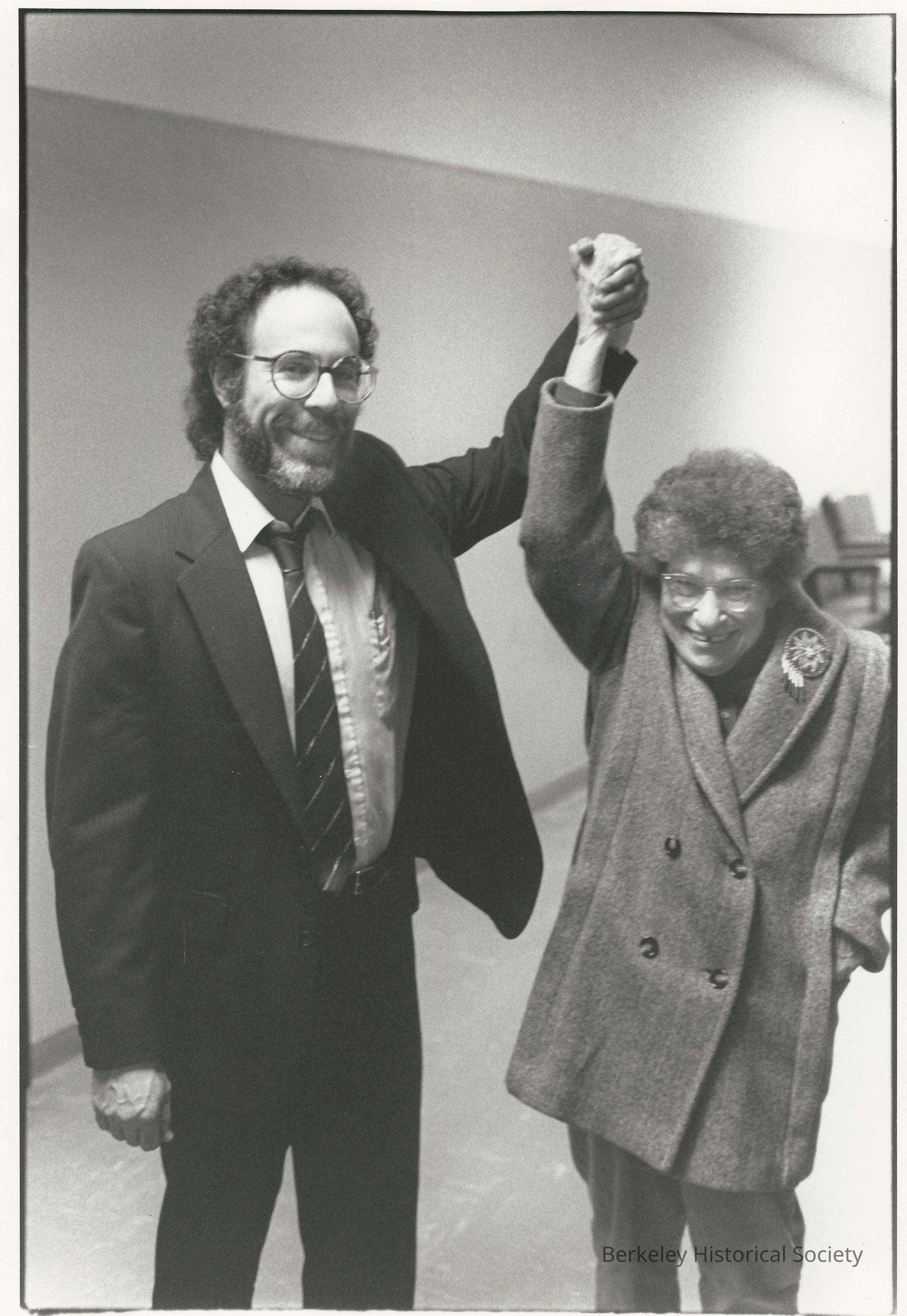 BCA attorney; with Florence McDonald. Rent board member Florence McDonald celebrate in courthouse hallway minutes after final tally , March 3, 5:45pm. [Year not in caption]Lexicon