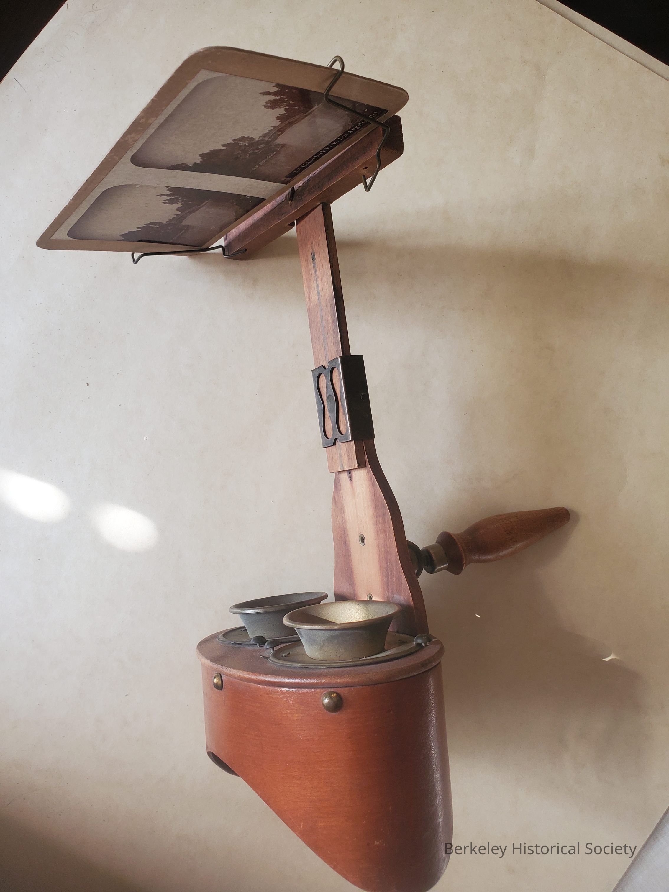 Stereoscope and ca. 50 stereo photographs, only about 10 of which are of California scenes. Instrument is somewhat delicate and should be used with supervision.Dimensions
