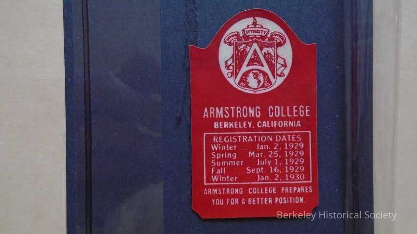 Sticker for Armstrong College, Berkeley, California in red and white with logo, and registration dates for winter jan 2, 1929 through winter Jan 2, 1930 .Made/Created