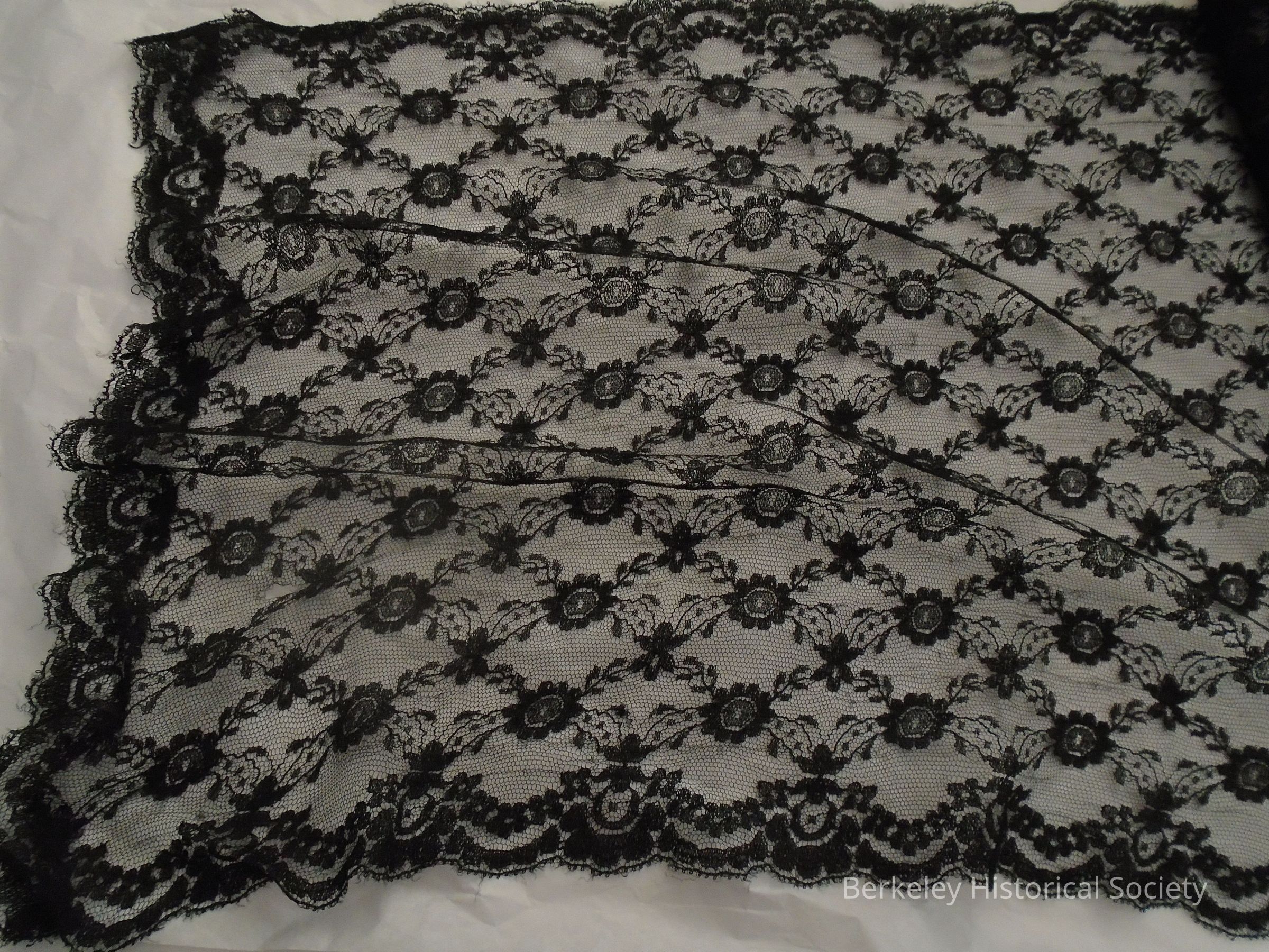 Rectangular, black, glace lace stole. Floral design, scalloped edges. For family history see 2006.036.001.