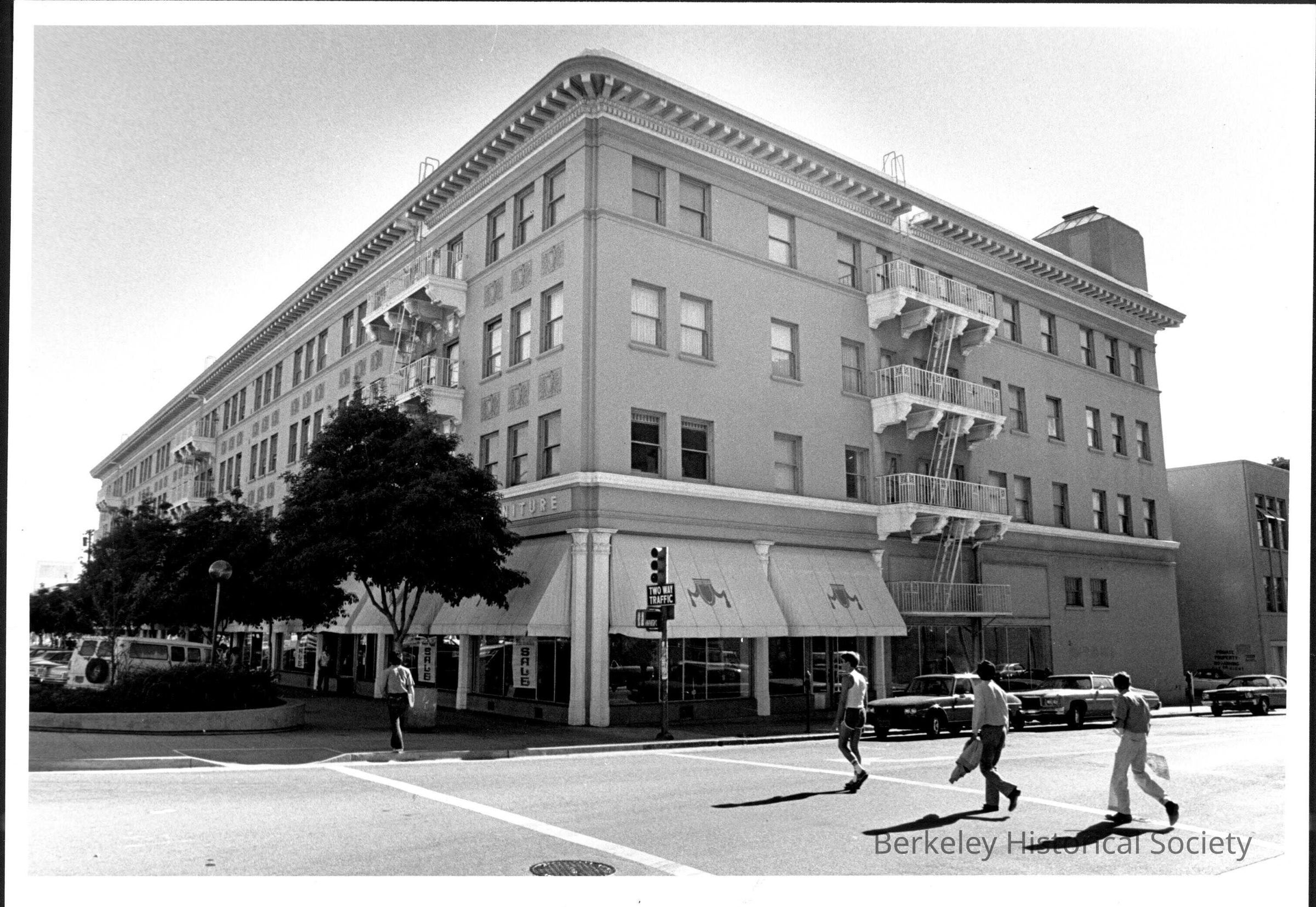 Corner of Stone Pierce Furniture & Shattuck Apartments from Shattuck & Milvia