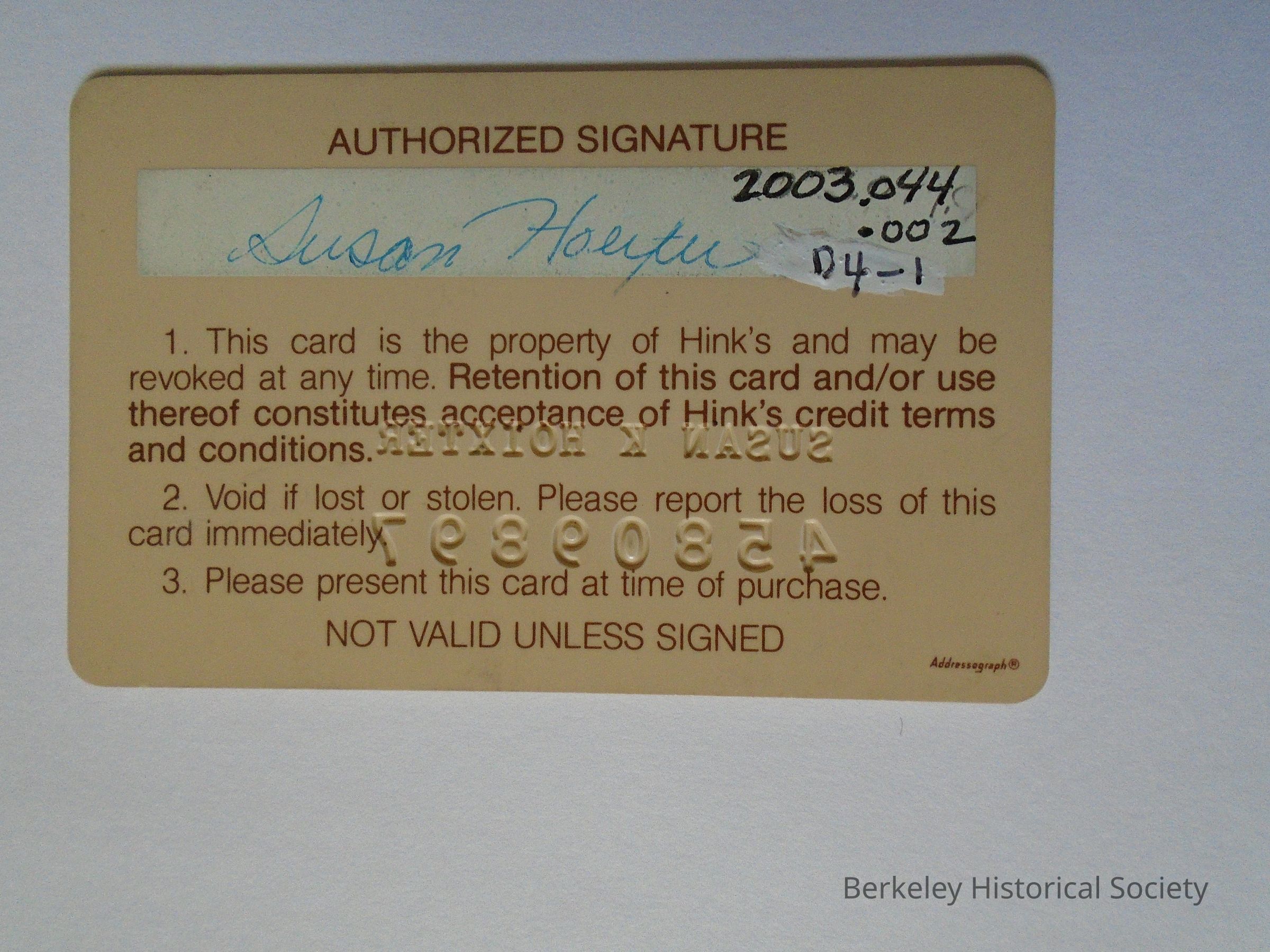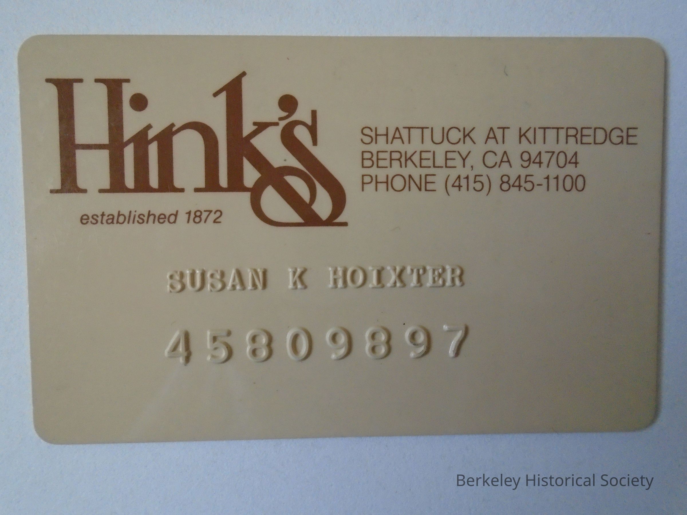 Plastic, beige and brown, store card for Hink's (department store), Shattuck at Kittredge, Berkeley, CA 94704, phone 415 845-1100. Name of Susan K. Hoixter.Lexicon