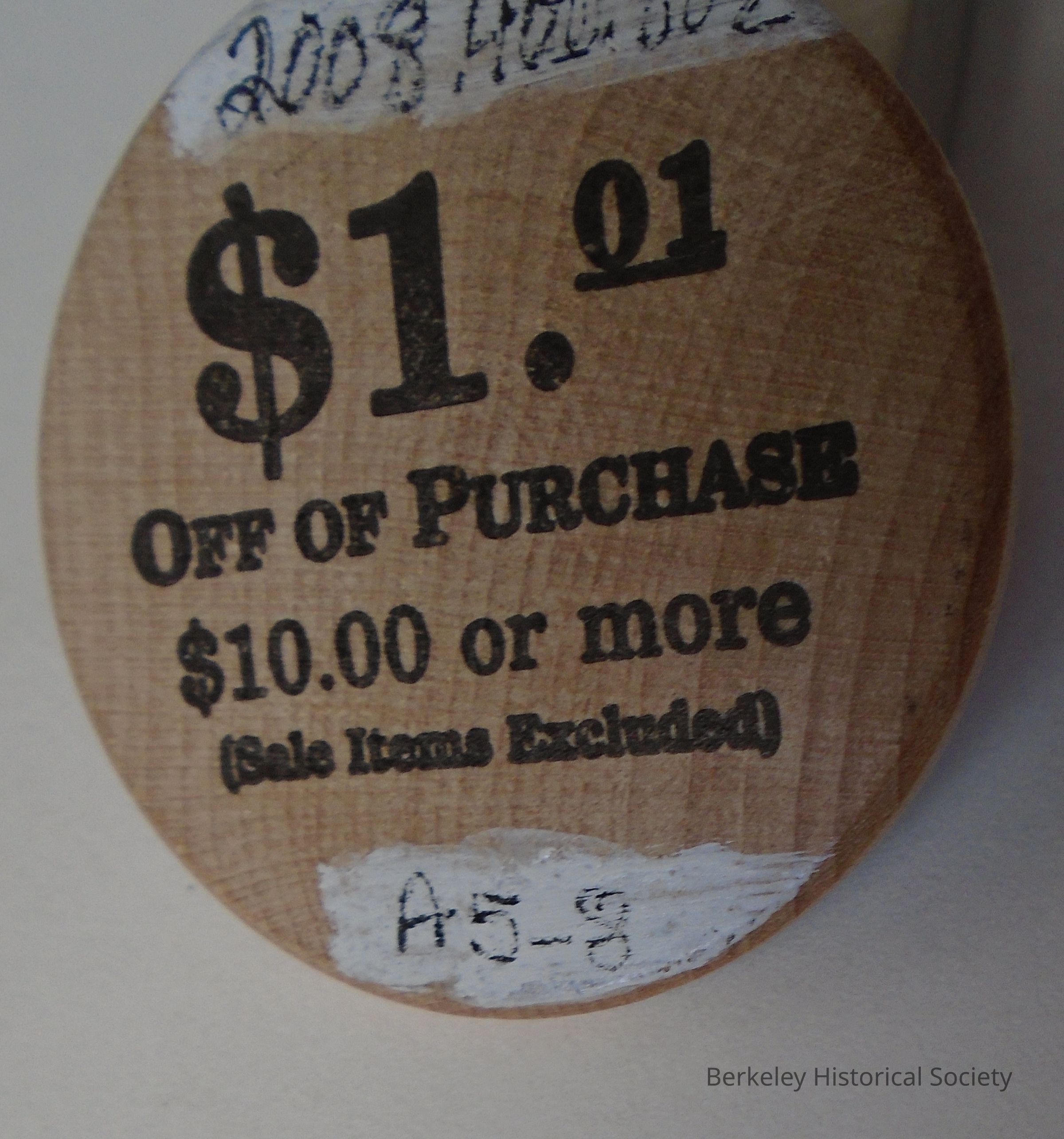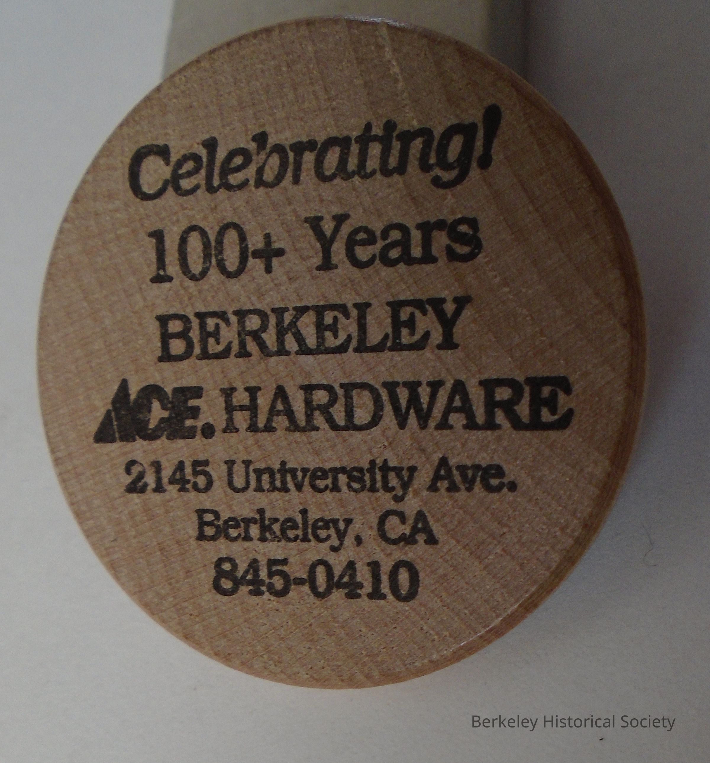 Ace Hardware wooden token worth $1.01 off purchase $10.00 or more. "Celebrating 100+ years Berkeley Ace Hardware 2145 University Ave., Berkeley Ca, 845-410 ". See also 2013.001.013 (duplicate).