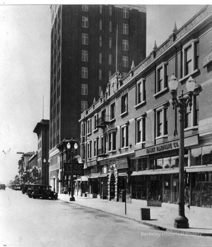 Shattuck and Center street scene with Sunset Hardware, California Optical (Col. Hardy), Ingall's Shoes, Roy O Long Real Estate, Chamber Of Commerce (later American Trust Company, Wells Fargo).Made/Created