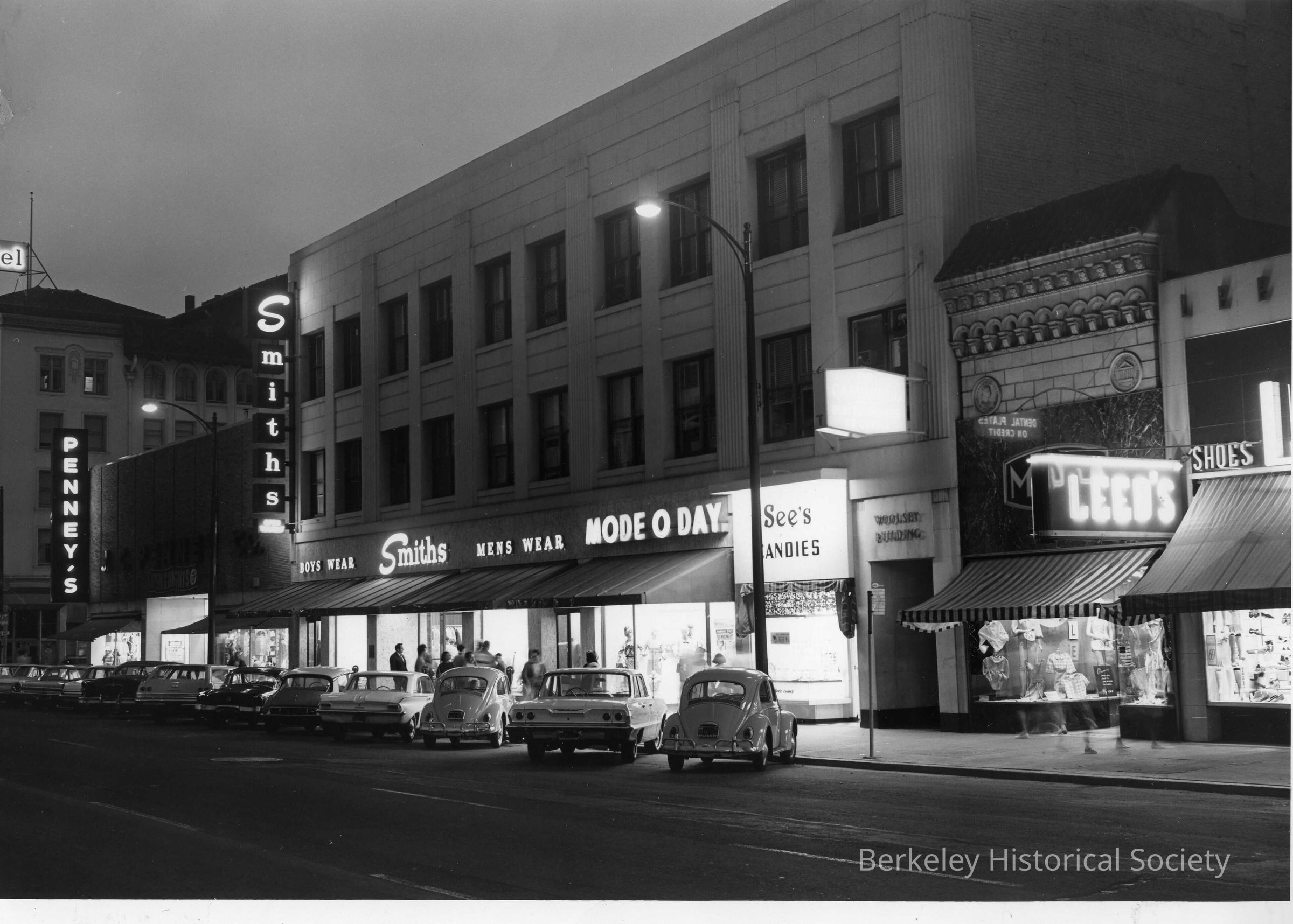 Evening street scene on Shattuck Ave. with J.C. Penny's, Smith's Men's Wear, Mode O Day, See's Candies and Leed's ShoesMade/Created