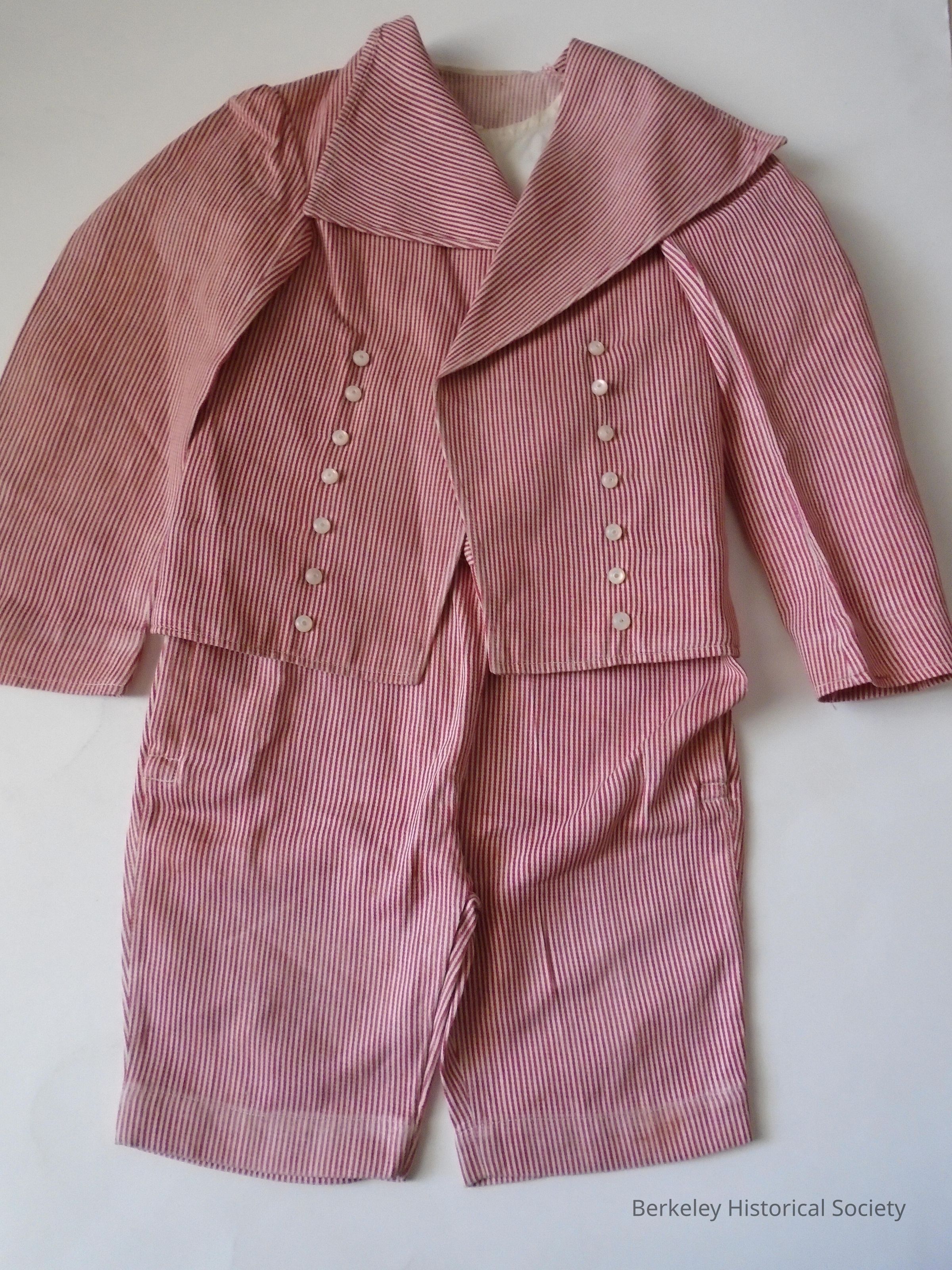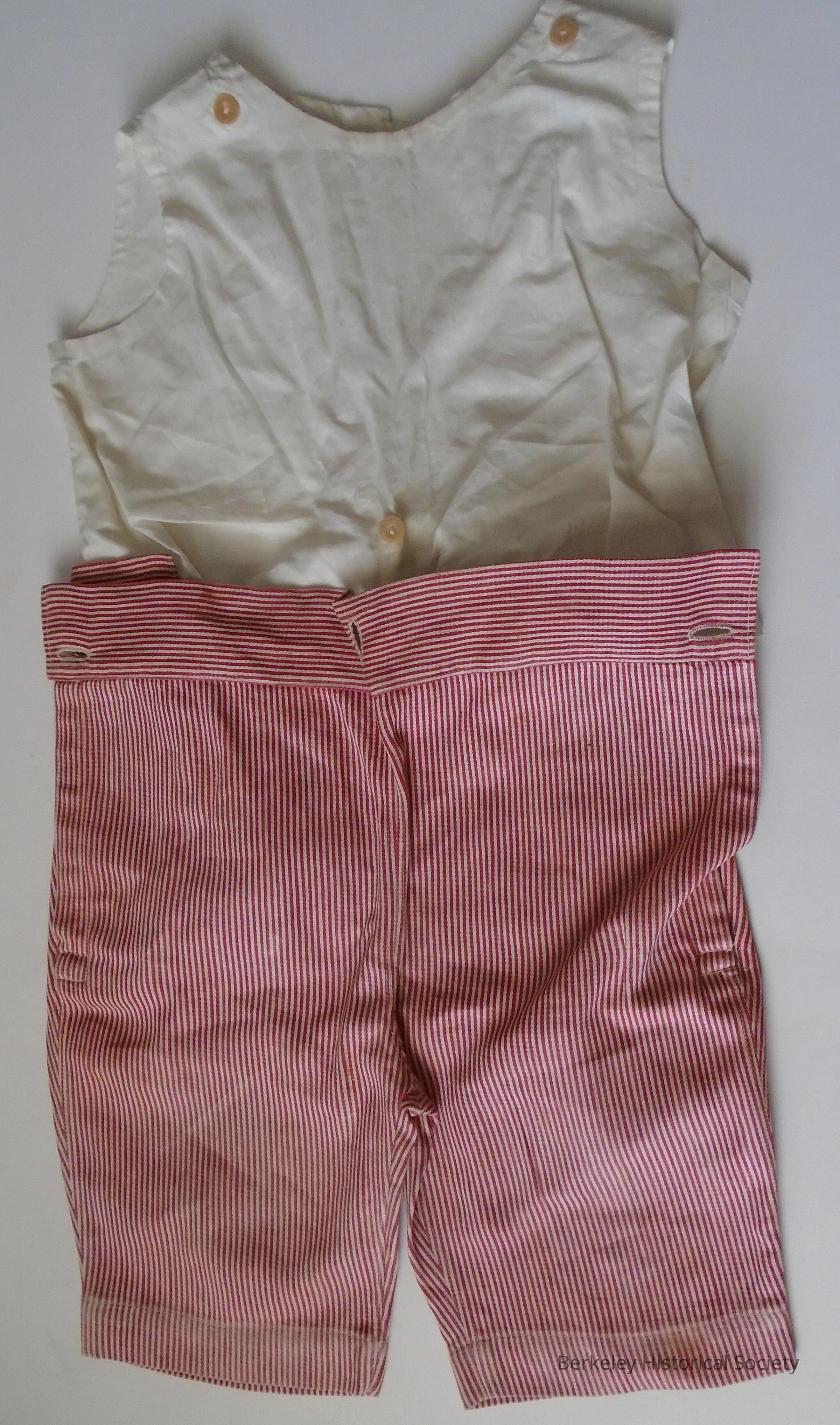 Child's 3 piece cotton suit (probably boy's about 3 yrs old). Red and white stripe pants and jacket with white sleeveless shirt top that buttons to pants. Jacket has wide labels and two rows of pearl buttons in front. Pants button and have 1 side pocket. De Fremery family in Berkeley.