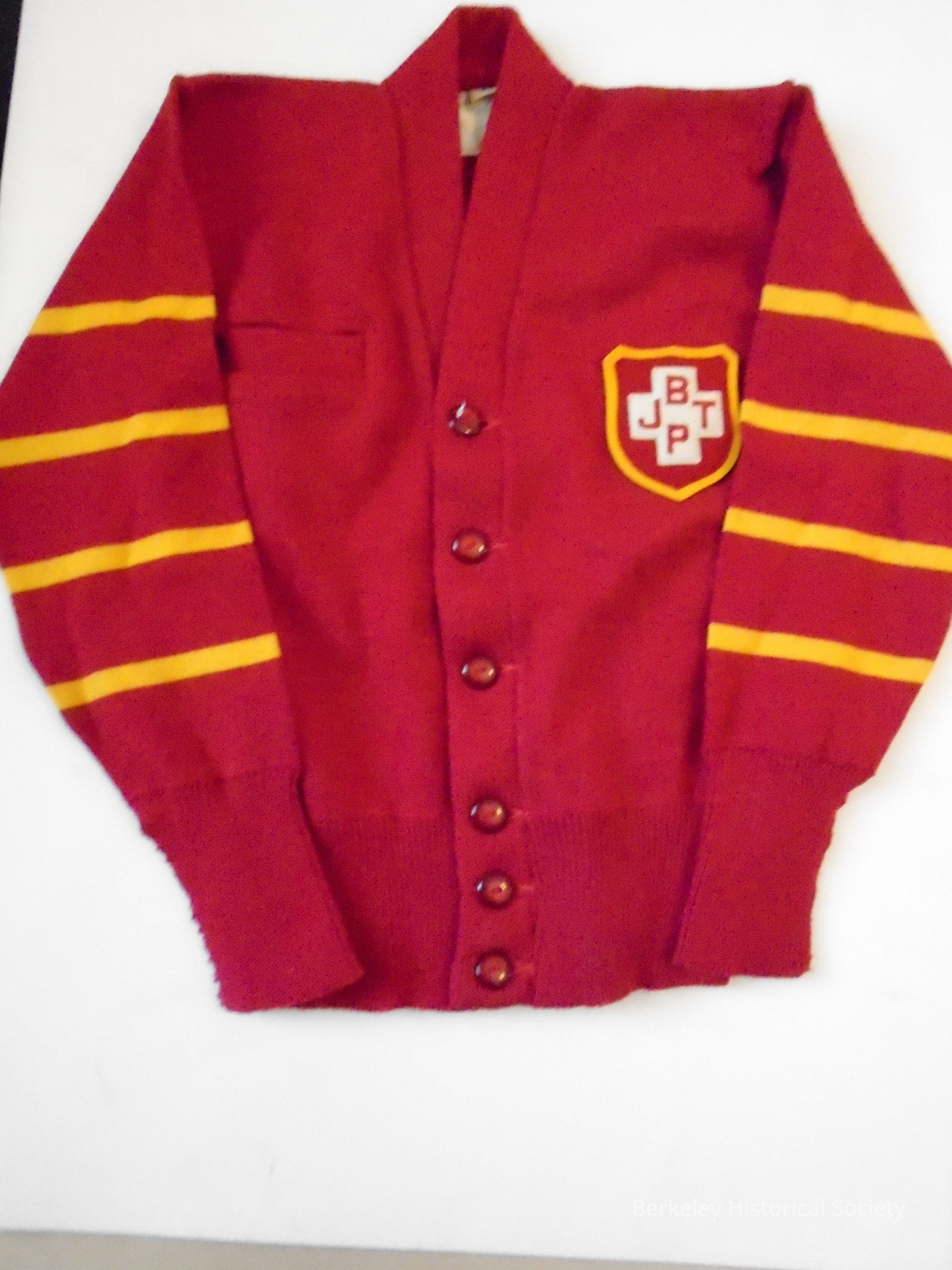Berkeley Junior Traffic Police cardigan sweater. Red wool with yellow strips on sleeves and felt BJTP emblem in white, yellow and red on left side. Pocket on right side. Label faded. Size M.Made/Created