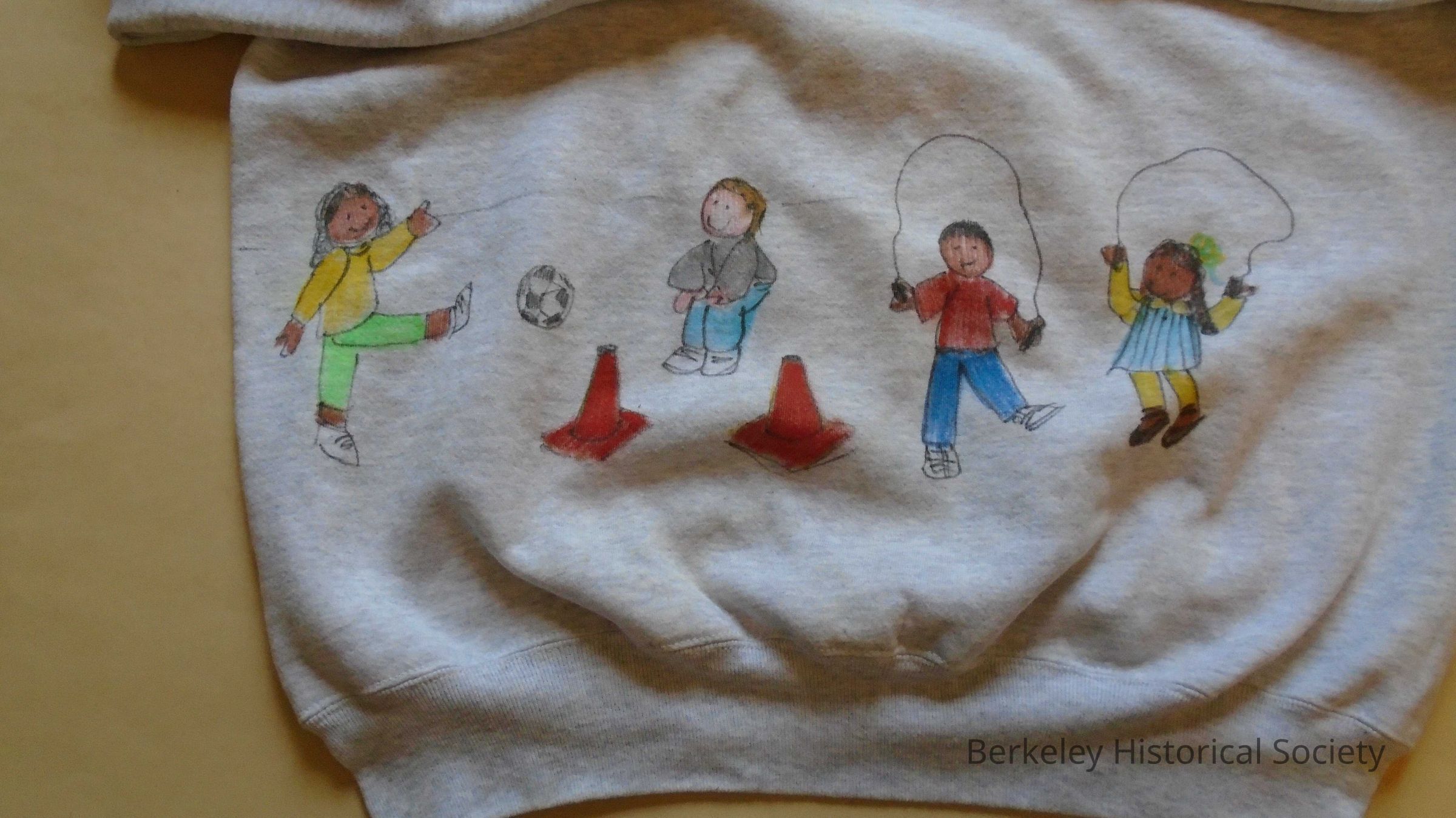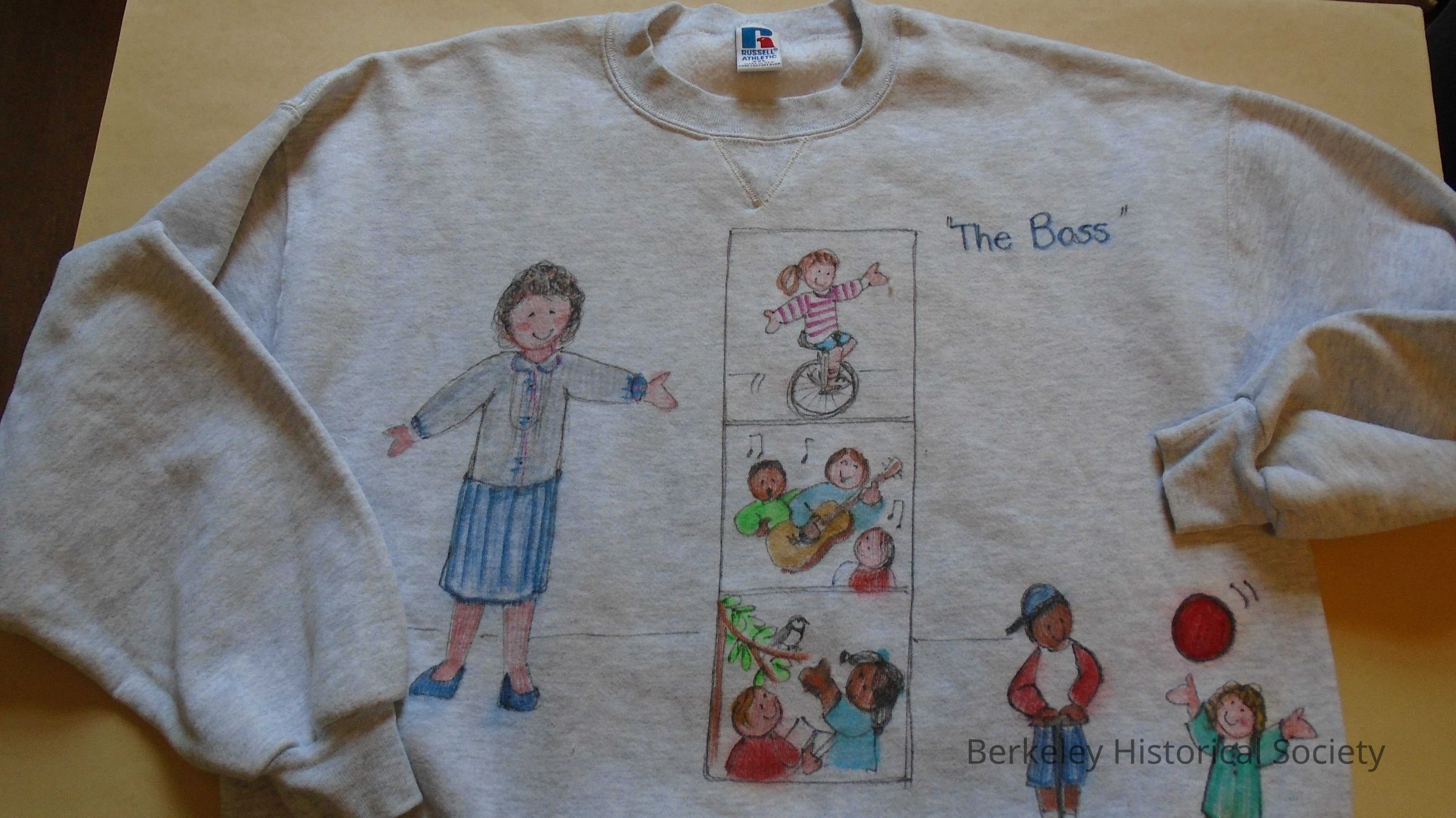 Grey long sleeved sweatshirt. Label: Russel Athletic 50/50 cotton & polyester, XXL. Hand drawn pictures (child's) in color on front and back, of children playing (soccer, guitar, unicycle), A drawing of a female teacher on the front with "The Boss" written at the top. Probably given to a teacher by Berkeley school kids.Lexicon