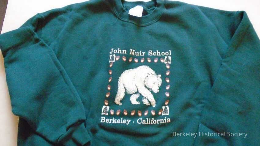 Green long sleeved sweatshirt, 50/50 cotton & polyester, size 2X, label: Jerzees. Picture of a bear on front with "John Muir School Berkleley California" and paw prints around it.