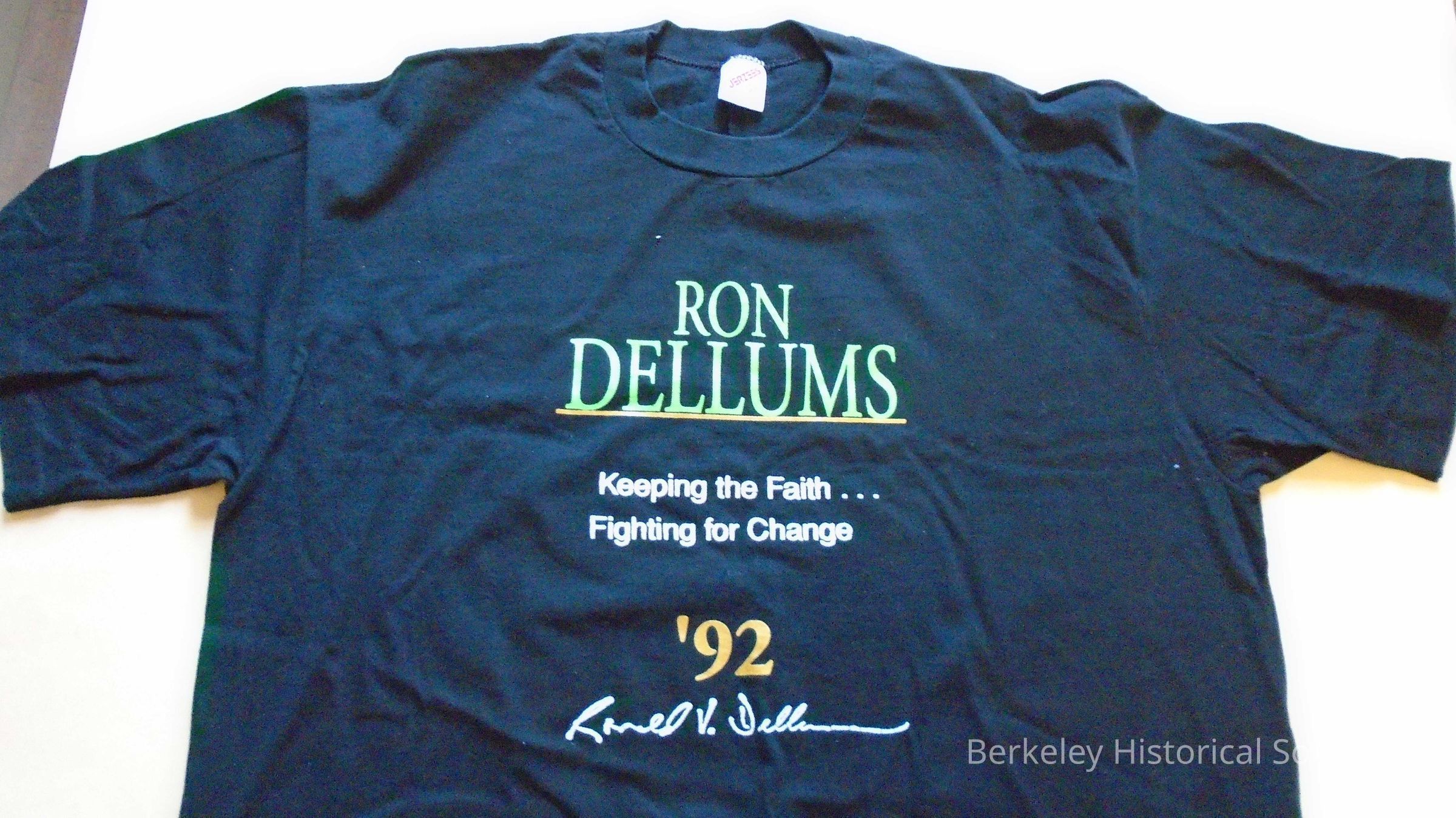Black, short sleeved cotton, XXL T-shirt with "Ron Dellums Keeping the Faith...Fighting for Change '92" on the front in wheite and Green.