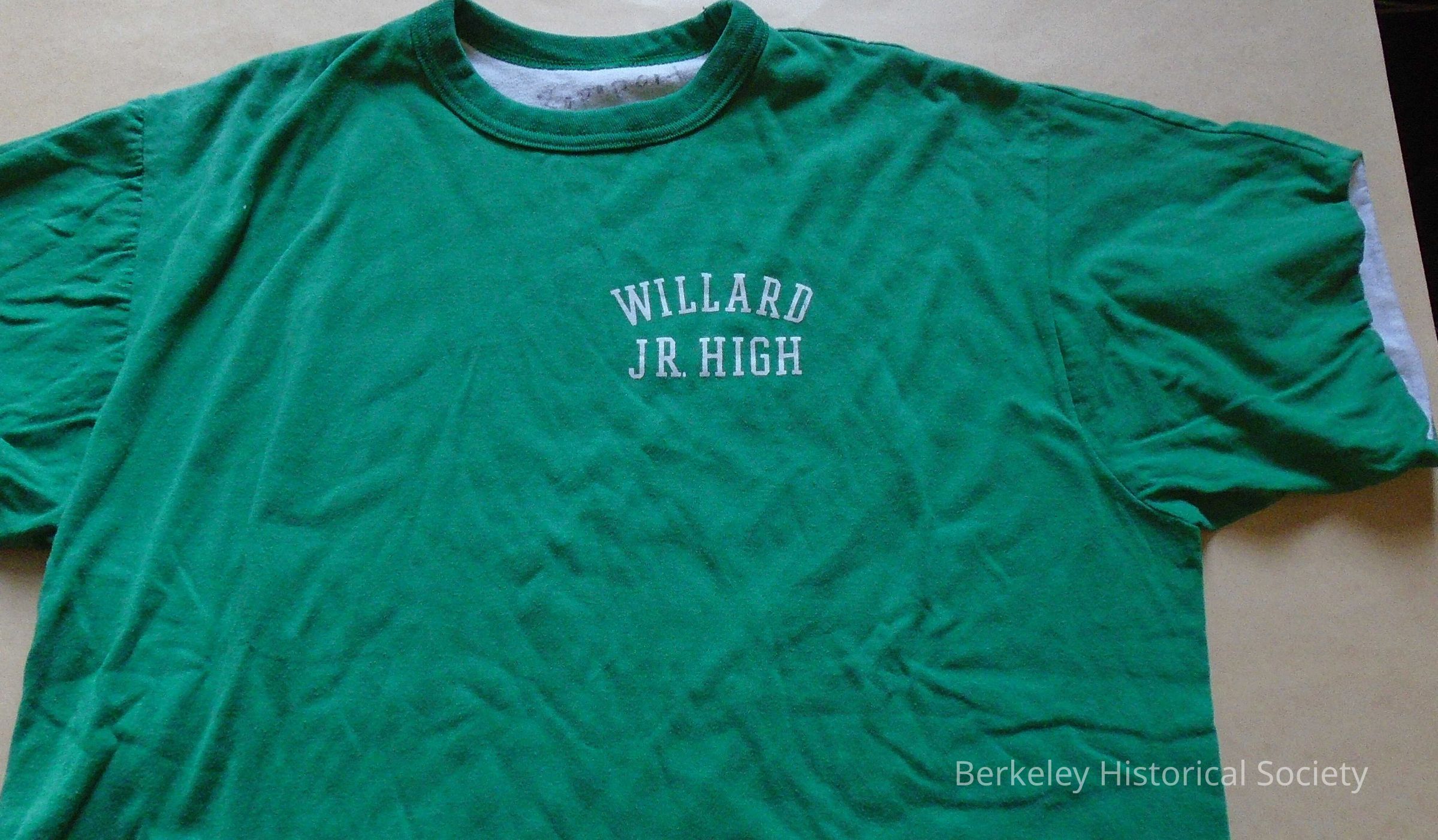 Short sleeved green cotton T-shirt (tee shirt), lined. Gym uniform, text: "WILLARD JR. HIGH". No label. Last name of Rapaport written inside in black ink.