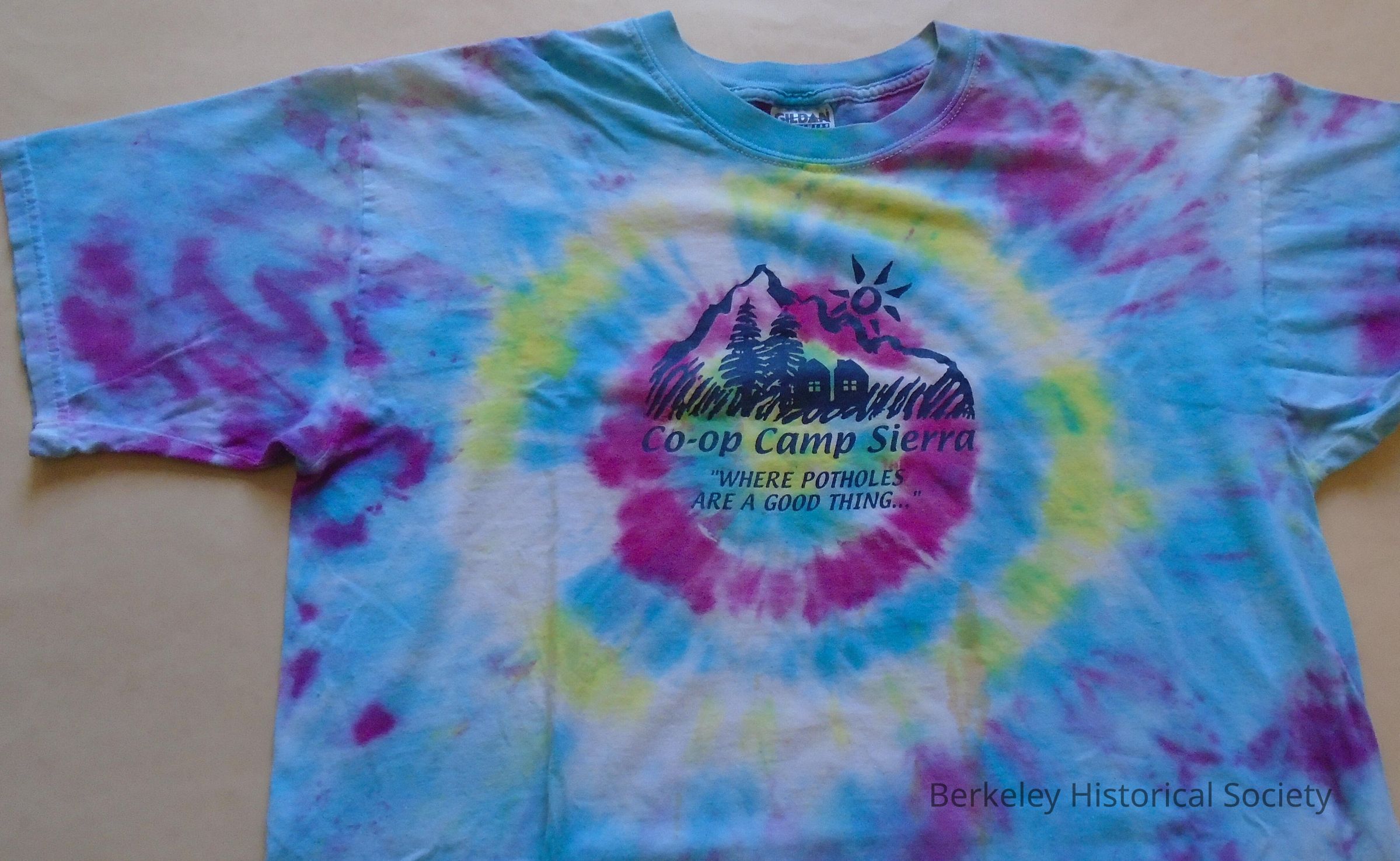 Cotton, tie-dyed, short sleeved T-shirt with picture of trees & cabins and text "Co-op Camp Sierra. Where potholes are a good thing". Colors of turquoise, pink, yellow. Size XL . Brand: Gildan Activewear.