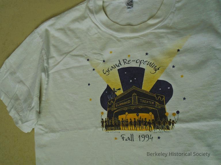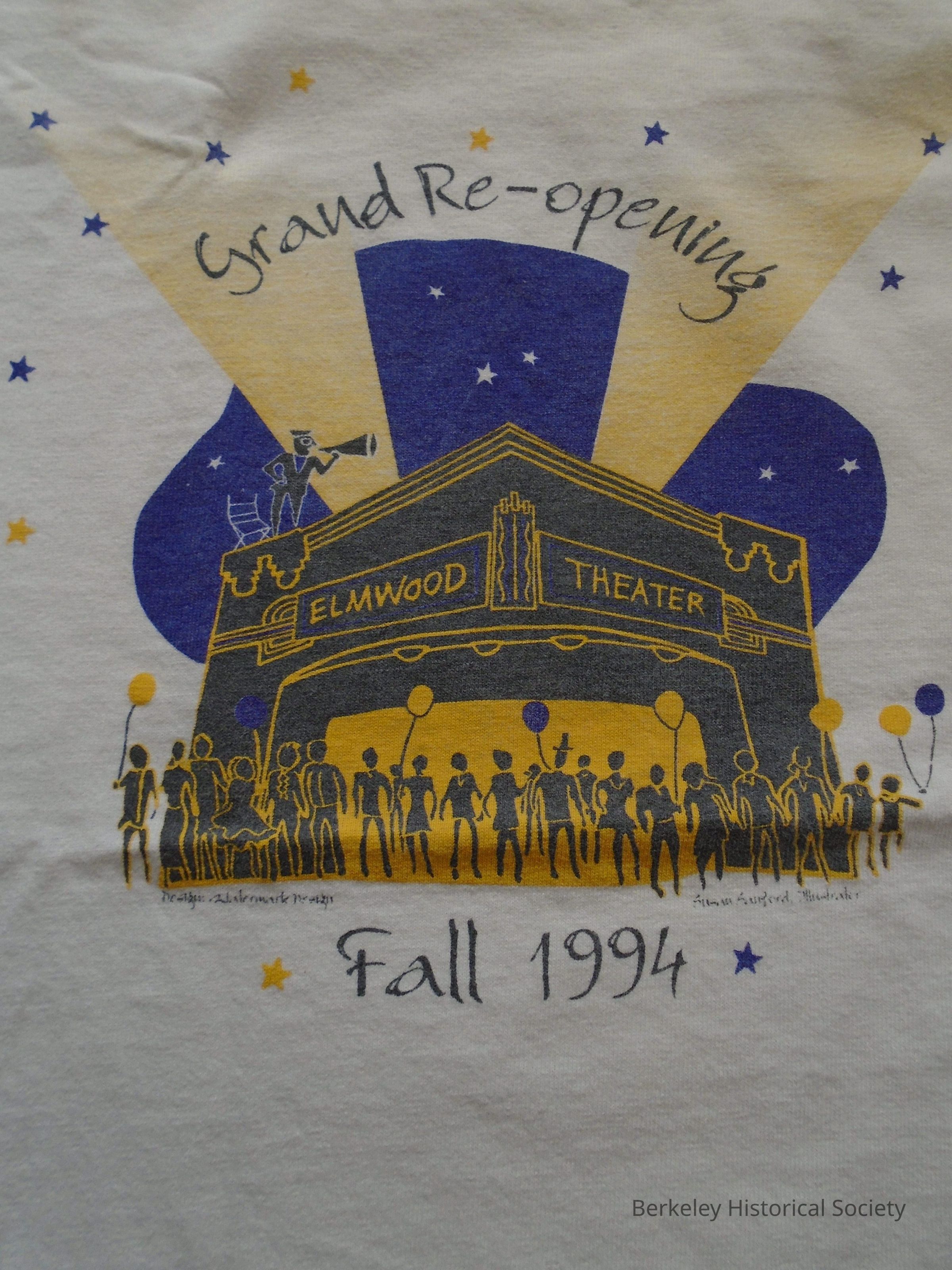White cotton short-sleeve T-Shirt advertising "Grand Re-opening Elmwood Theater (Elmwood Theatre) Fall 1994". Image on front in gold and purple shows Elmwood Theater with spotlights above and people in front with balloons. Credit for design is at the bottom of image, but not readable.