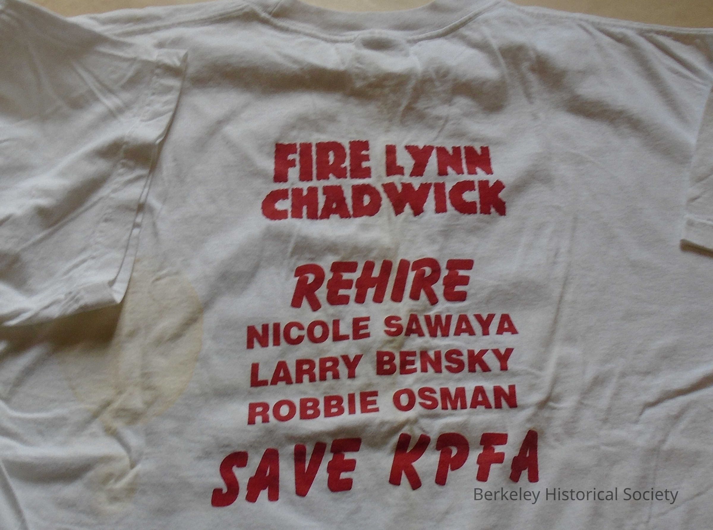 White cotton, short sleeve T-shirt, 2X-large. Text in red on front: "Free speech radio?" Picture of KPFA protest, Pacifica Executive Director and General Manager Lynn Chadwick 6/21/99. Text on back: "Fire Lynn Chadwick Rehire Nicole Sawaya, Larry Bensky, Robbie Osman. Save KPFA."Lexicon
