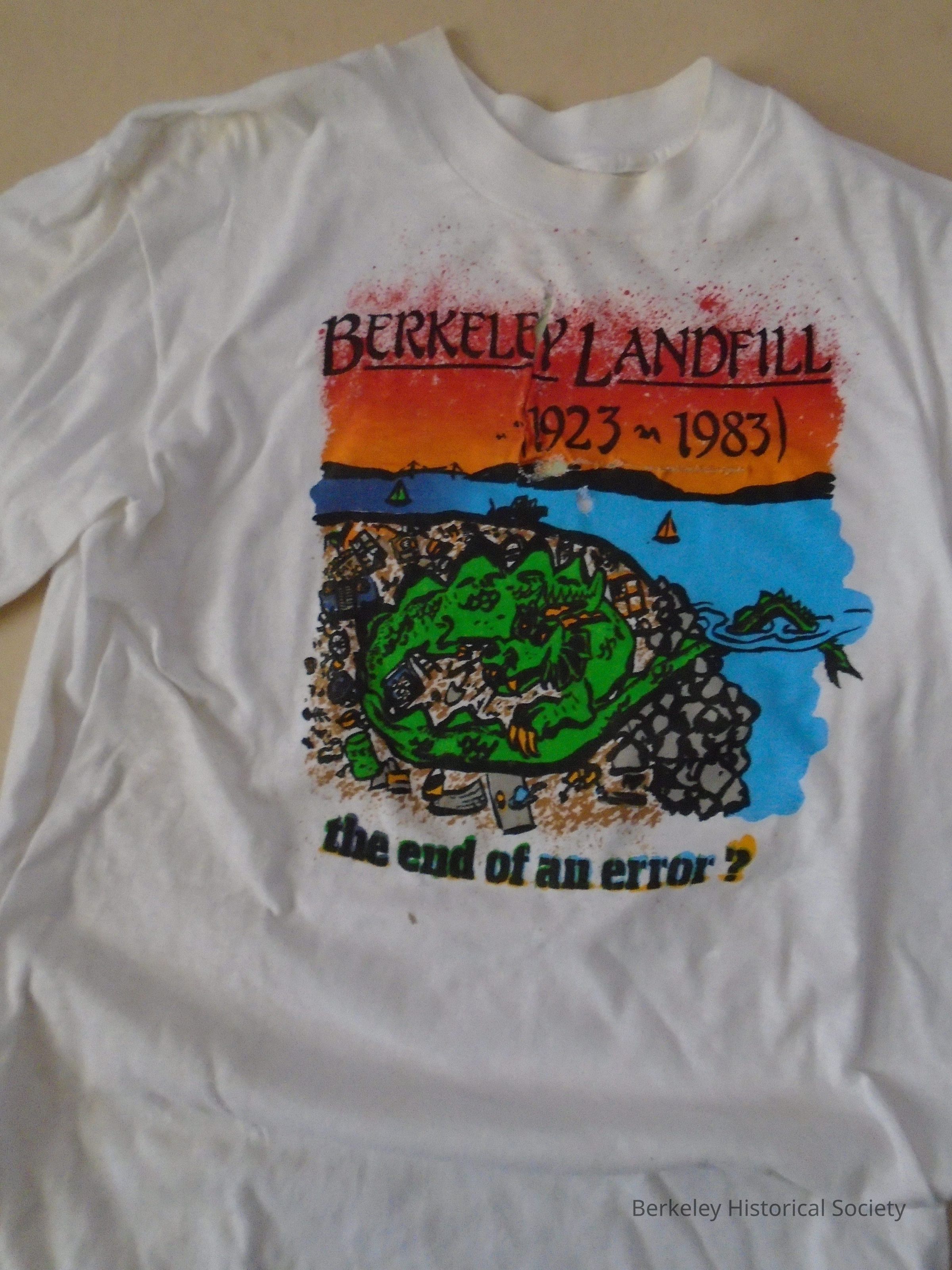 White cotton T-shirt with multicolored picture of the Berkeley landfill overlayed with a serpent on front and text "Berkeley Landfill 1923-1983 the end of an error?" Size Large (42-44).