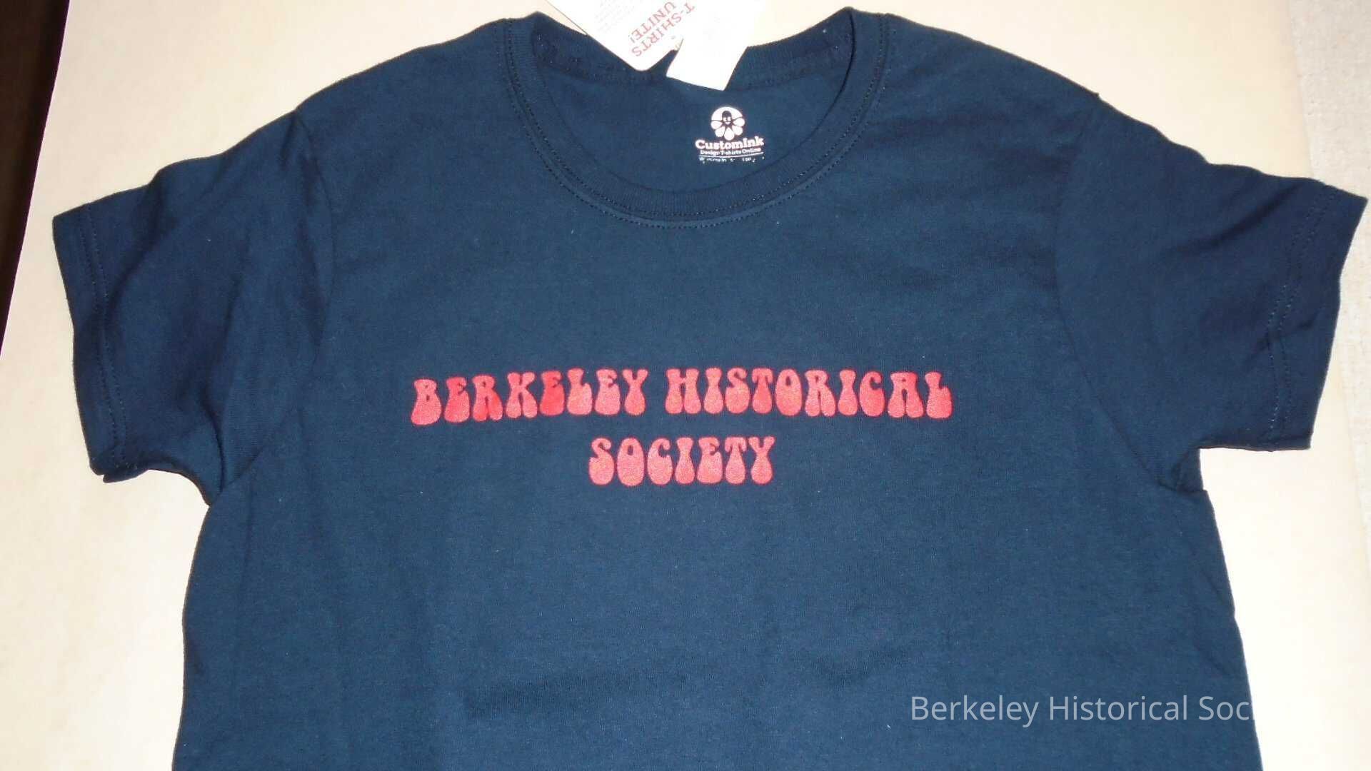 Black, short sleeved, cotton T-shirt. Front shows "Berkeley Historical Society" in red. Back shows outline of Campanile in purple with red "Soundtrack to the 60s, Berkeley Music Scene", advertising exhibit at Berkeley Historical Society 1931 Center Street from Oct 8 2017 to April 1 2018. Size small. Made by Customlink.