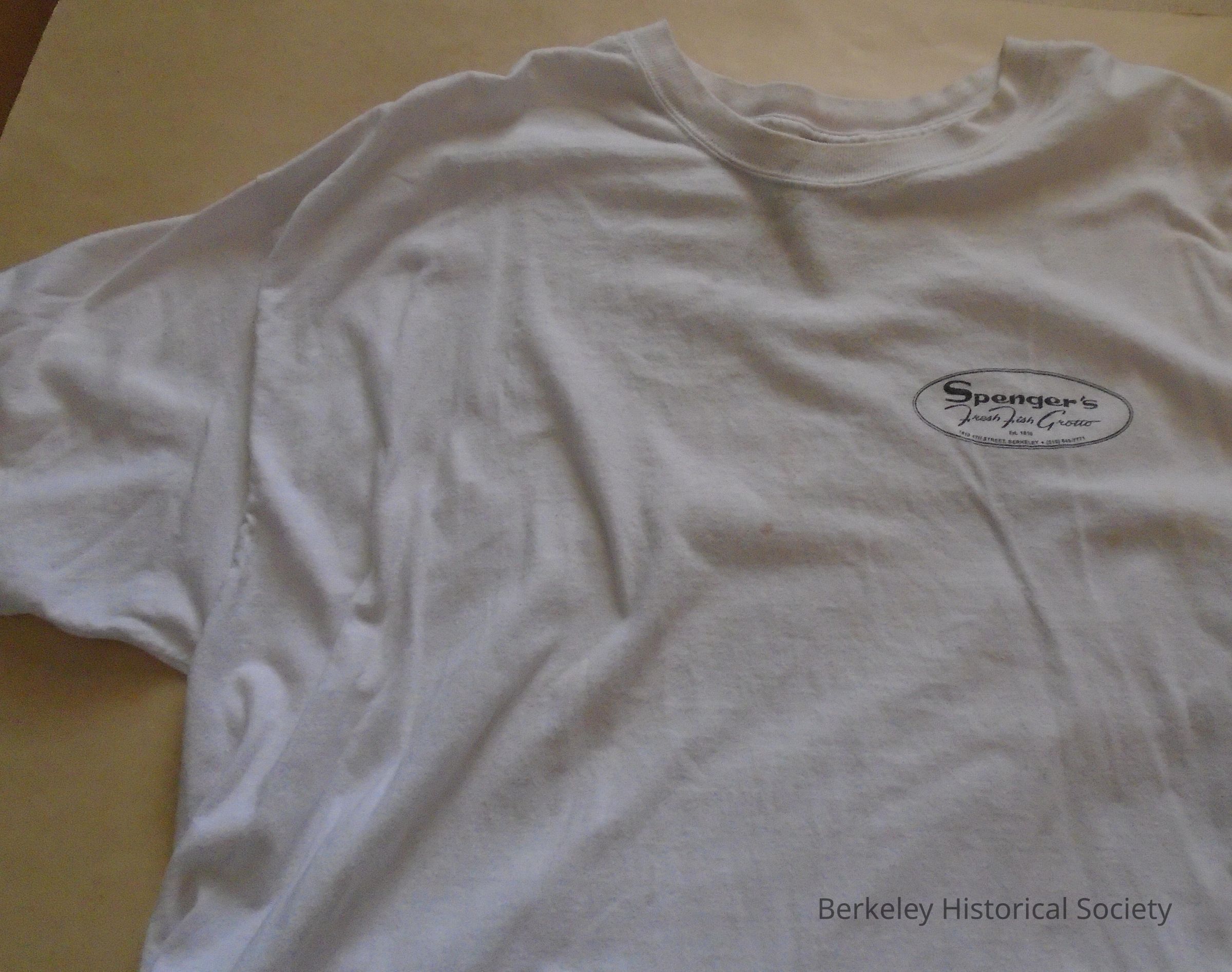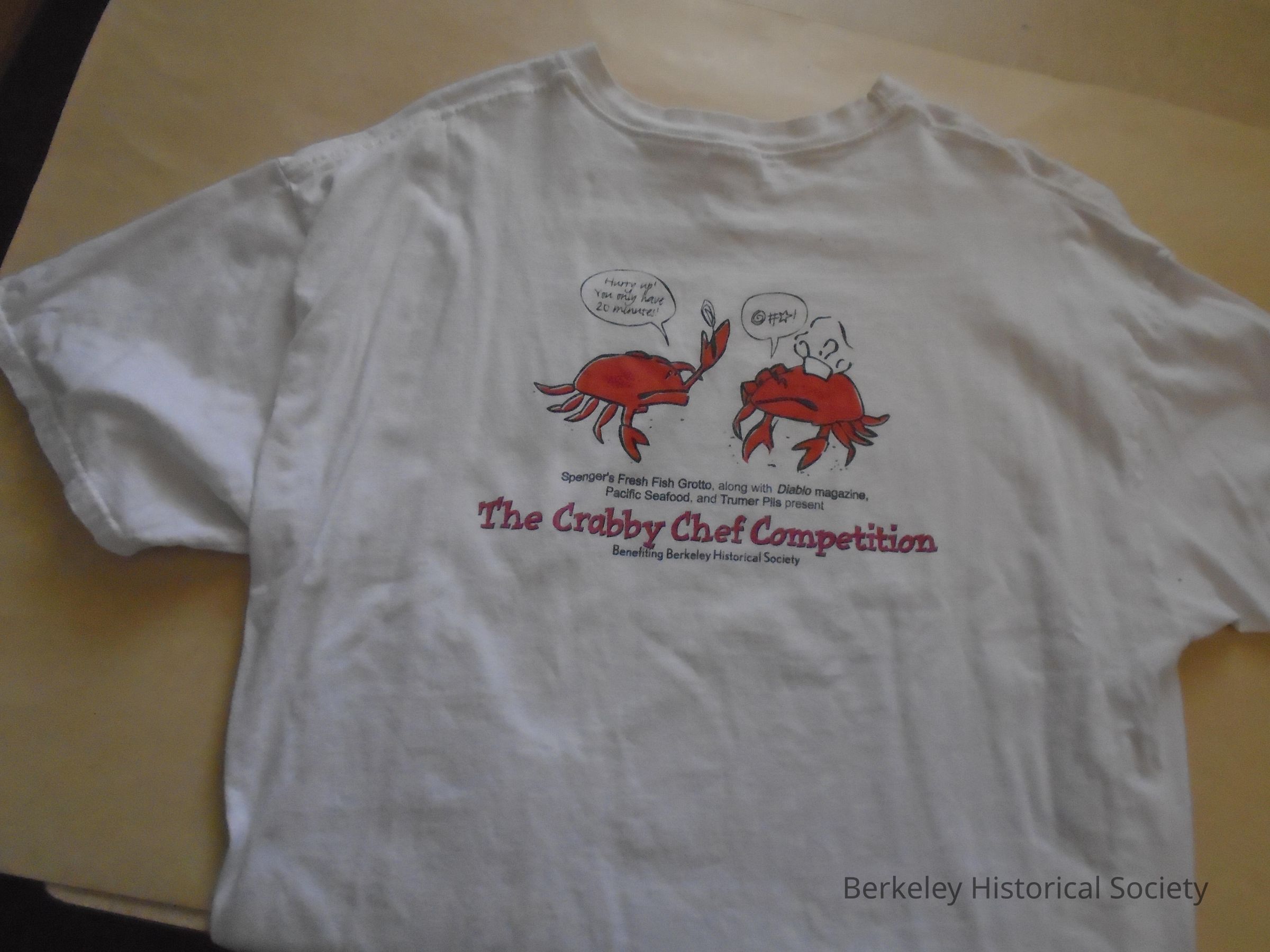 White, cotton, short sleeved T-shirt. Hanes Beefy X-G. Back shows Spenger's Fresh Fish Grotto, Diablo magazine, Pacific Seafood and Trumer Pils present The Crabby Chef Competition benefiting Berkeley Historical Society. Picture of 2 crabs. Front has Spengers's Fresh Fish Grotto logo, 1919 4th Street, Est. 1890.