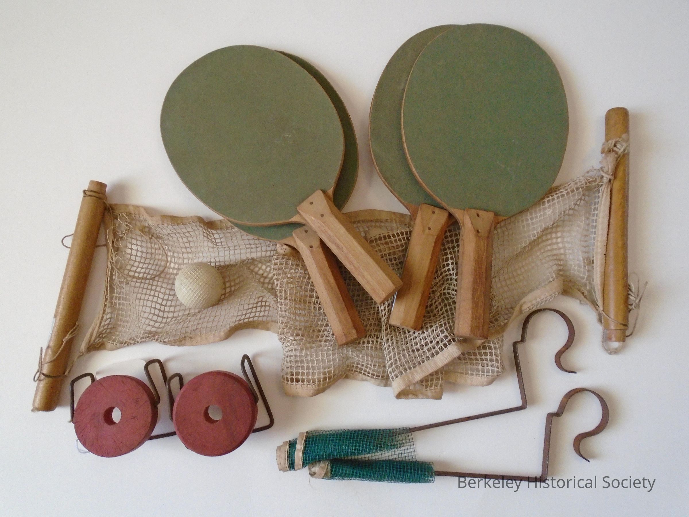 Table tennis set (aka paddle tennis, ping pong set). Set includes 4 wood paddles with green sand paper on one side, 1 ball, 2 nets. One net is white cotton with wood supports and separate attachments (reddish wood and metal) for table edge to hold wood supports. The other net is green nylon with metal supports to attach to table. 9 separate pieces in all, marked: a-d paddles, e-h nets, i ball. Probably used by Bill and Arza Ralph. 1711 Francisco ST.Made/Created